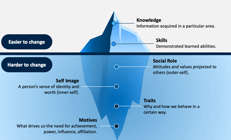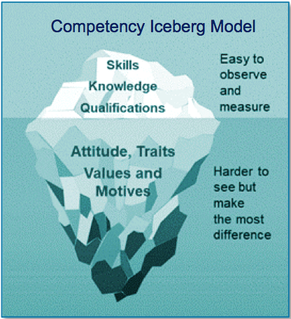 맥클랜드 교수에 따르면 빙산의상층부에있는지식(Knowledge)과스킬(Skills)이 역량의 구성요소 중 가시적인부분(Visible Part), 즉빙산의일각(一角)이다. 그리고 주로태도(Attitude)의영역에속하는특성(Traits)·가치관(Values)·동기(Motives) 등이 하층부에있는 역량의 비가시적부분(invisible part)이다.