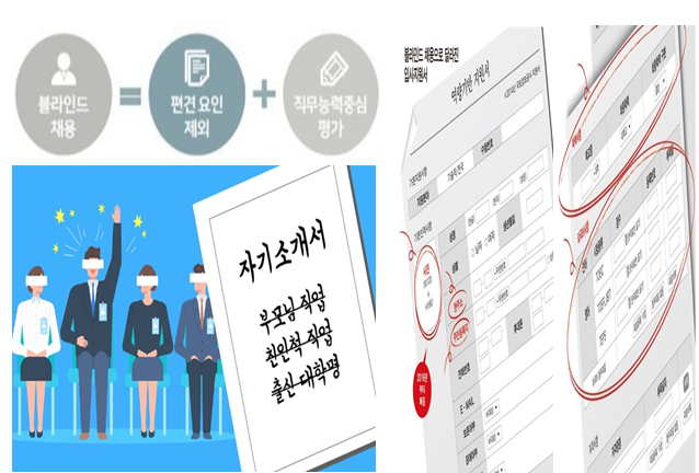 블라인드 채용이 바로 이런 불합리한 차별을 예방하자는 취지다. 이에 따라 입사지원서에서 편견을 부를 수 있는 항목(가족관계·출신지역·출신 학교 등)은 적지 못하도록 한다. 당연히 면접관에게도 지원자에 대한 개인적인 정보를 일절 제공하지 않는다.