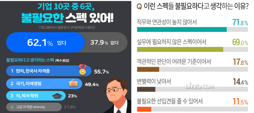 오히려 지원하는 기업이나 직무와동떨어져있거나채용공고에서요구하는수준을훨씬뛰어넘는 ‘오버스펙’이나 ‘잉여스펙’은 되려입사의진정성이나열정을의심하게만드는단초로작용해서평가에불리하게작용할수있다.
