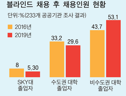 공기업 블라인드 채용 의무화 이후 서울대·고려대·연세대, 소위 SKY대 출신이 차지하는 비율이 3분의 1 가량 줄어든 것으로 나타났다. 교육 시민단체 사교육걱정없는세상(이하 사교육걱정)은 지난 9월 26일 낸 자료에서 공공기관 블라인드 채용 의무화 이후의 성과를 분석하고, “상위권 대학들이 채용시장 단계에서 누리던 특권 요소를 없애기 위해 블라인드 채용을 민간기업까지 확대해야 한다”라고 주장했다.