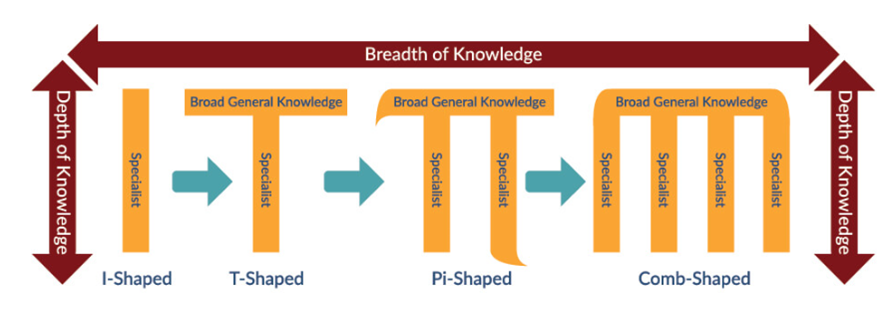 하지만 변화가 일상화되고 기술 혁신이 가속화하면서 이제는 한 사람이 모든 분야에서 전문성을 갖추기란 불가능한 시대가 되었다. 이러한 시대상을 반영해서 기업의 인재 육성 체계도 (ㅗ) 자형에서 (ㅜ) 자형으로 바뀌었다.