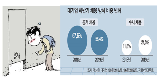 반대로 대기업의 수시 채용 비율은 지난해 하반기 11.8%에서 올해 하반기 24.5%로 비중으로만 보면 두 배 이상 늘어난 것으로 조사됐다. 중소·중견기업을 포함한 하반기 채용 예정 기업의 채용방식은 공채가 49.6%, 수시 채용이 30.7%, 인턴 후 직원 전환이 19.6%였다-출처: 매일경제 2019.8.26