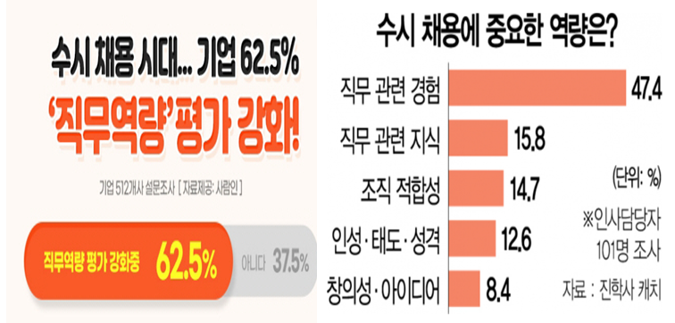 그래서 최근에는 직무별로 필요한 인재를 그때그때 바로 뽑아 쓰는 직무중심의 ‘수시 채용’이 대세로 자리 잡았다.