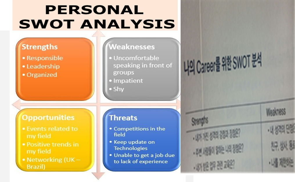 SWOT 분석은 나라는 상품을 세일즈 하는 취업이라는 마케팅에서도 아주 유용한 툴(Tool)이다. 취업시장에서 수많은 경쟁상품과 비교할 때 나라는 상품의 강점은 무엇인지(Strength), 약점은 무엇인지(Weakness), 또 기회(요인)는 무엇인지(Opportunity), 위기는 무엇인지(Threats) 등 스스로를 객관화시켜 정리해보는 것이다.