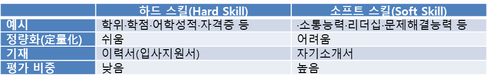 채용을 할 때도 마찬가지다. 그래서 기업은 상대적으로 정량화가 쉬운 하드 스킬, 즉 스펙은 이력서(입사 지원서), 정량화하기 어려운 소프트 스킬은 자기소개서를 통해 파악한다.