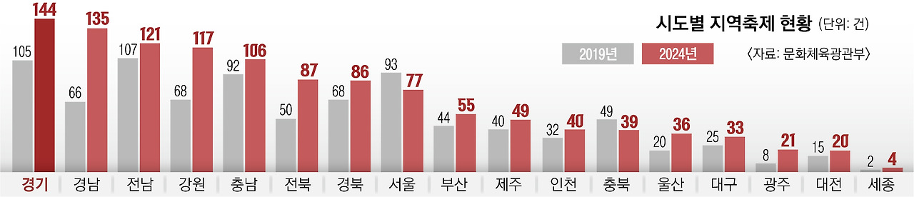 지자체의 행사가 늘었다는 사실은 수치로 보면 더욱 명확하다. 문화체육관광부의 연도별 지역축제 계획을 보면, 2019년 884개였던 지역 축제가 2024년에는 1,170개로 늘었다. 불과 5년 사이 32%나 증가한 것이다. 특히 경남 지역은 더 극적이다. 같은 기간 66개에서 135개로 늘었다. 두 배 이상이다. 통계에 포함된 축제는 ‘2일 이상 열리고, 지자체·주민·단체가 공동으로 주최하며, 불특정 다수가 참여하는 문화·관광·예술 행사’만 잡혔다. 그렇다면 지역 축제와 같은 행사가 늘어나는 이유는 무엇일까. 표면적인 이유는 침체된 지역경제를 활성화하겠다는 것이다. 지방의 인구는 줄고, 기업 유치는 쉽지 않다. 비교적 단기간에 사람을 모으고 소비를 촉진할 수 있는 것은 축제 같은 관광 상품이다. 하지만 축제가 많아질수록 개별 축제가 가진 힘은 약해진다. 축구 경기가 많아질수록 경기의 질이 떨어지듯, 축제가 많아질수록 축제의 질은 떨어진다.