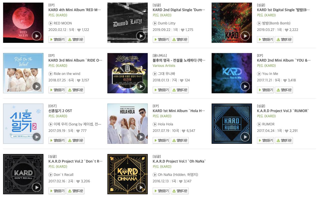고등학교 졸업 이후 아이돌 가수 덕질은 더 이상 안할줄 알았다. 그런데.. 딱 수능 끝나고 할일 없던 당시 발매되었던 KARD의 'Oh NaNa' 가 완전히 내 취향을 저격했고, 그 뒤로 나왔던 음악들도 줄줄히 나의 심장에 홈런을 날리는 바람에 이제는 음원발매하면 무조건 듣고 + 뮤비 감상하고 + 무대 챙겨보는 그룹이 되어버렸다. 그들에 대해 기본적인 소개를 하자면 KARD의 그룹명은 각 멤버의 컨셉 포지션을 가리키는 King, Ace, color jokeR / black jokeR, (hiDden kard)의 약자로 이루어져 지어진 것이다. 멤버는(나이순) BM, J.Seph, 소민, 지우로 이루어져있는 혼성그룹이다. 싱글앨범 3개를 데뷔 이전 냈었고, 이 세곡이 예상외로 해외에서 반응이 있어 미니앨범 'Hola Hola' 로 2017년 7월 정식데뷔를 했다. 그래서인지 데뷔 전 발매되었던 세 곡의 무대를 음악방송에서 보지 못했다는 점에 대해 팬들(물론 나도..)은 매우 아쉬워하고 있다. 정식데뷔 이후 꾸준히 앨범 발매와 해외투어를 다녔고, 2020년 2월 12일! 약 5개월만에 그들이 'RED MOON' 으로 컴백했다.