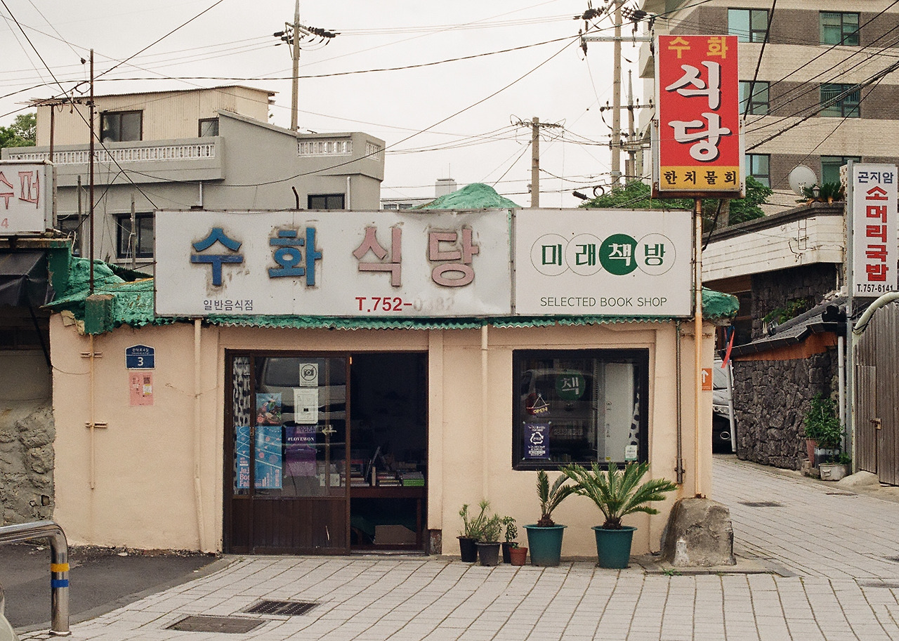 제주도 여행 첫날, 지인에게 소개받은 책방에 가기로 했다. 책방 이름은 ‘미래 책방’. 도착하자 미래 책방 옆에는 ‘수화 식당’이란 옛 간판이 함께 걸려 있었다. 찾아본 결과 제주에서 가장 오래된 식당의 간판으로 기념비적으로 남겨 놓은 것임을 알 수 있었다. 나는 이런 책방에서 제주 여행의 기념비적인 책을 사고 싶은 마음이 들었다