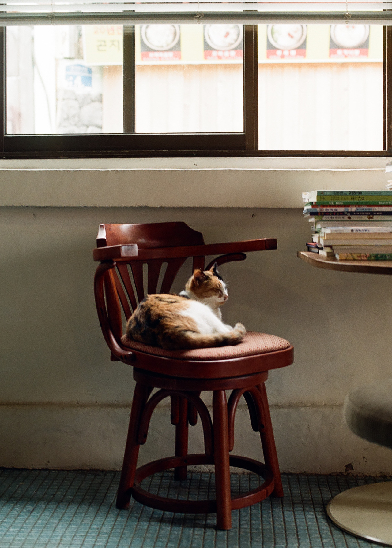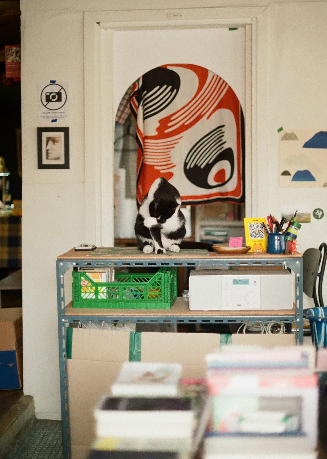 안으로 들어서니 작은 공간에 두 가지 재미가 있었다. 첫 번째는 독립출판 도서들과 고양이 두 마리, 두 번째는 왼편 구석에서 필름 카메라와 필름 매거진, 액세서리 등을 판매하는 <구석 카메라>가 있었다. 먼저 책방 카운터에 앉아 있는 고양이를 쓰다듬고 <구석 카메라>로 향했다. 구석 카메라의 공간은 책방과 다른 모습처럼 느껴졌다