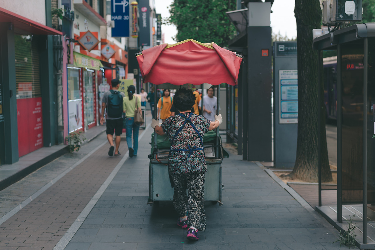 그녀는 분식을 조리하는 작은 리어카를 끌고 가고 있다.