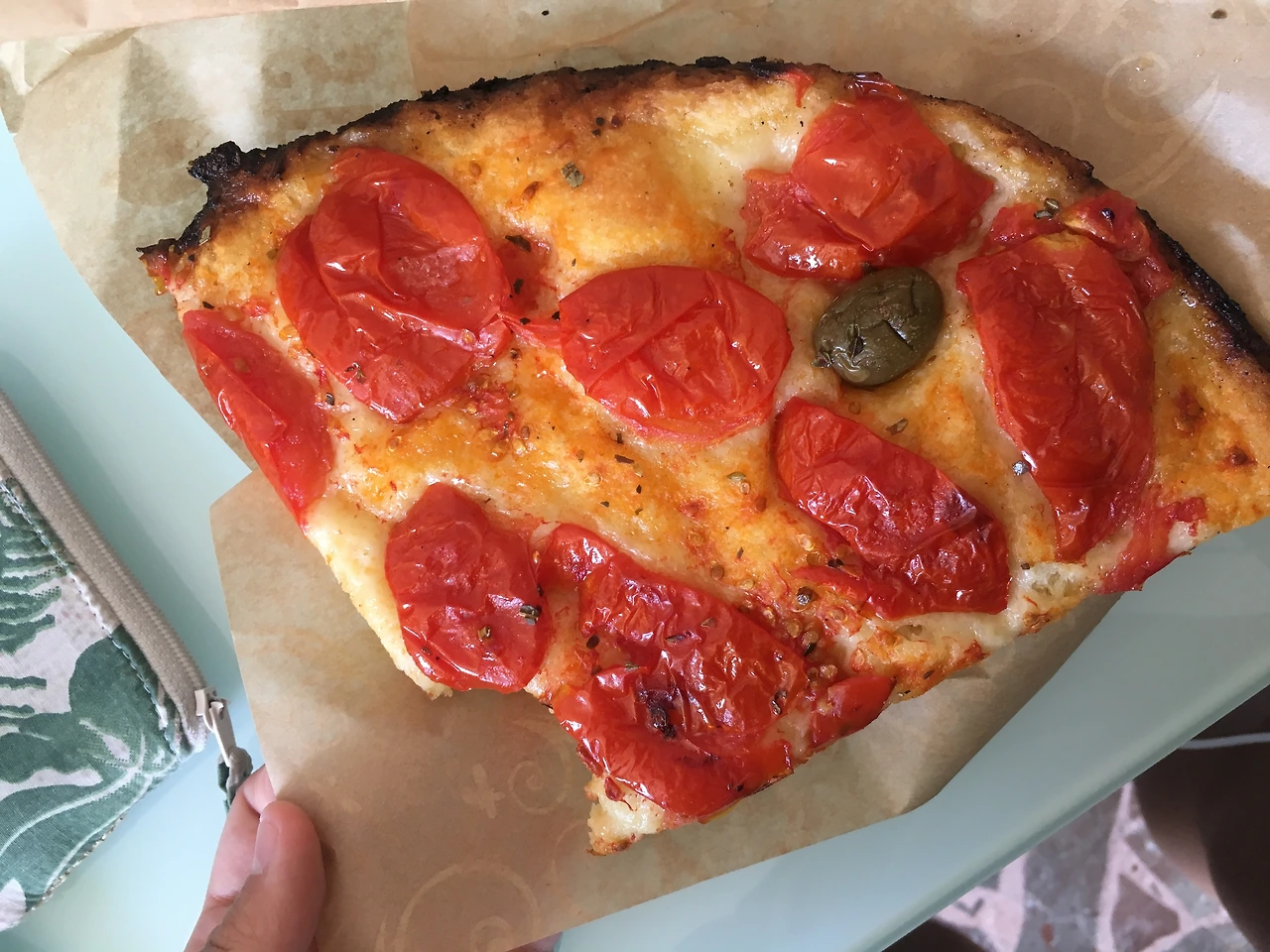 슈퍼마켓에 가는 길에 길을 잃어 근처 아무 가게에 들어가 물어봐야 했다. 인종차별 당할까 잔뜩 긴장한 상태였는데 귀찮을 만한 일에도 환하게 웃으며 반쯤 데려다주기까지 하는 이탈리아 사람의 친근함에 벌써 반해버렸다. 오는 길에는 집 앞 스낵 가게에서 피자(인줄 알았는데 나중에 알고보니 포카치아였다)를 한조각(거대한 피자 한판 크기의 1/4) 사 먹었는데, 그냥 두꺼운 도우에 토마토일 뿐인데 어떻게 이렇게까지 맛있을 수 있지, 하는 맛이었다. 문화충격. 밑면은 바삭하고 윗부분은 비건 치즈 잔뜩 뿌린 것 처럼 촉촉하니 살살 녹는다. 거기다 짭짤한 토마토와 올리브로 천국에 보내주는 맛.
