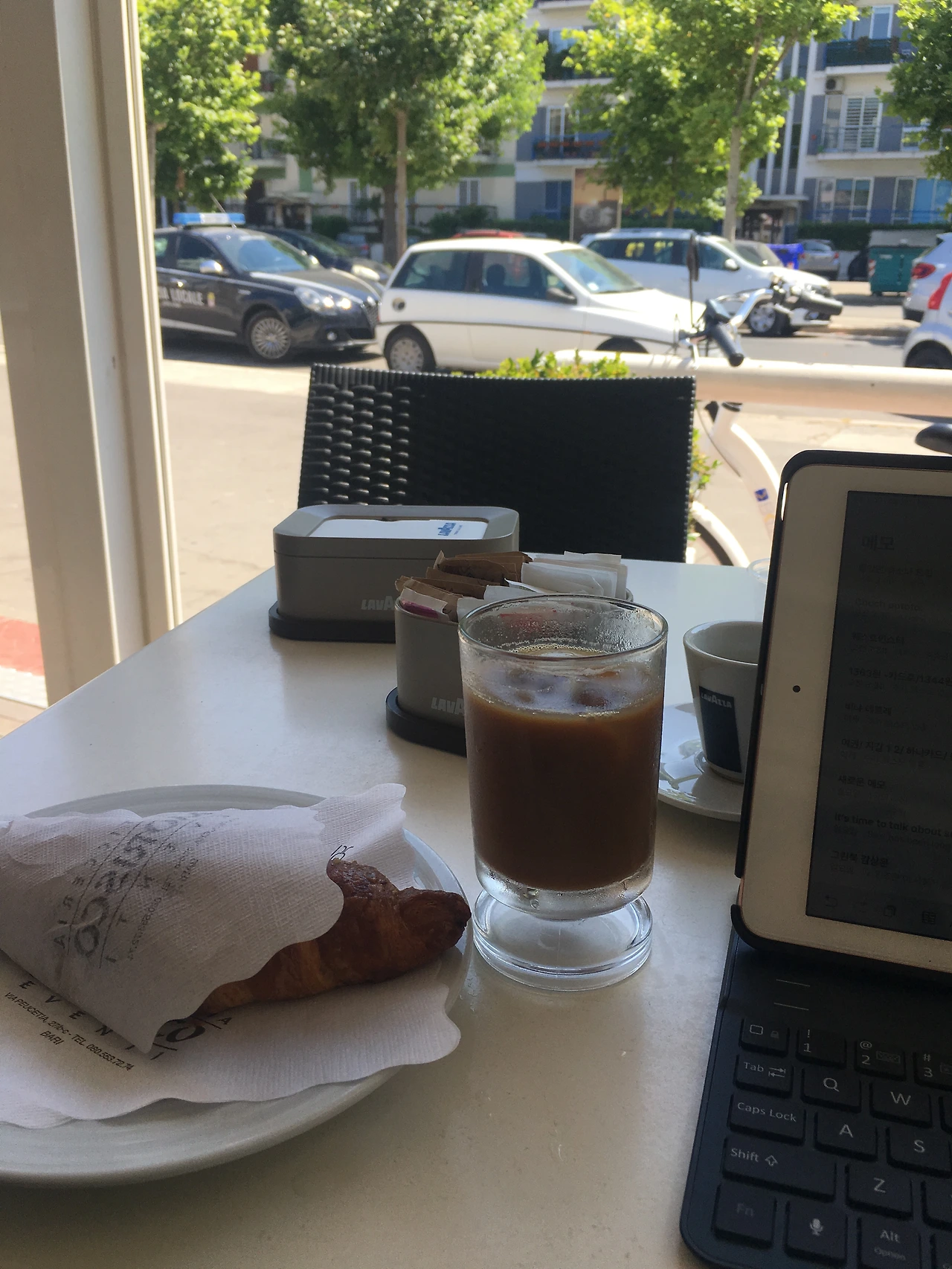 도로가 카페 테라스에 앉아 글을 쓰기 시작했다. 한참이나 지나서 젊은 남직원이 에스프레소, 물, 두유를 각각 따로 가지고 왔다. 무조건 순서는 에스프레소다. 뭐야, 나 에스프레소 시켰어? 하다가 두유를 내려놓는 걸 보고 안심. 이미 썼지만 여기선 절대 라떼를 만들어주지 않는다. 우리가 상상하던 에스프레소 인간들이다. 그렇게 들이켜고 낮잠은 잘도 잔다. 그리고 크로아상은 내가 제일 좋아하는 한국 비건 빵집인 우부래도처럼 바삭하진 않았지만 안에 결이 가볍고 안에 오렌지잼이 너무 달지 않게 들어있어서 맛있었다. 순식간에 하나를 해치우고 곧 도착할 영이를 위해 하나 더 시켰더니 수염난 남직원이 맛있냐고, 알았다고 하며 윙크를 하고 간다. 오, 이탈리아 남자 목격!
