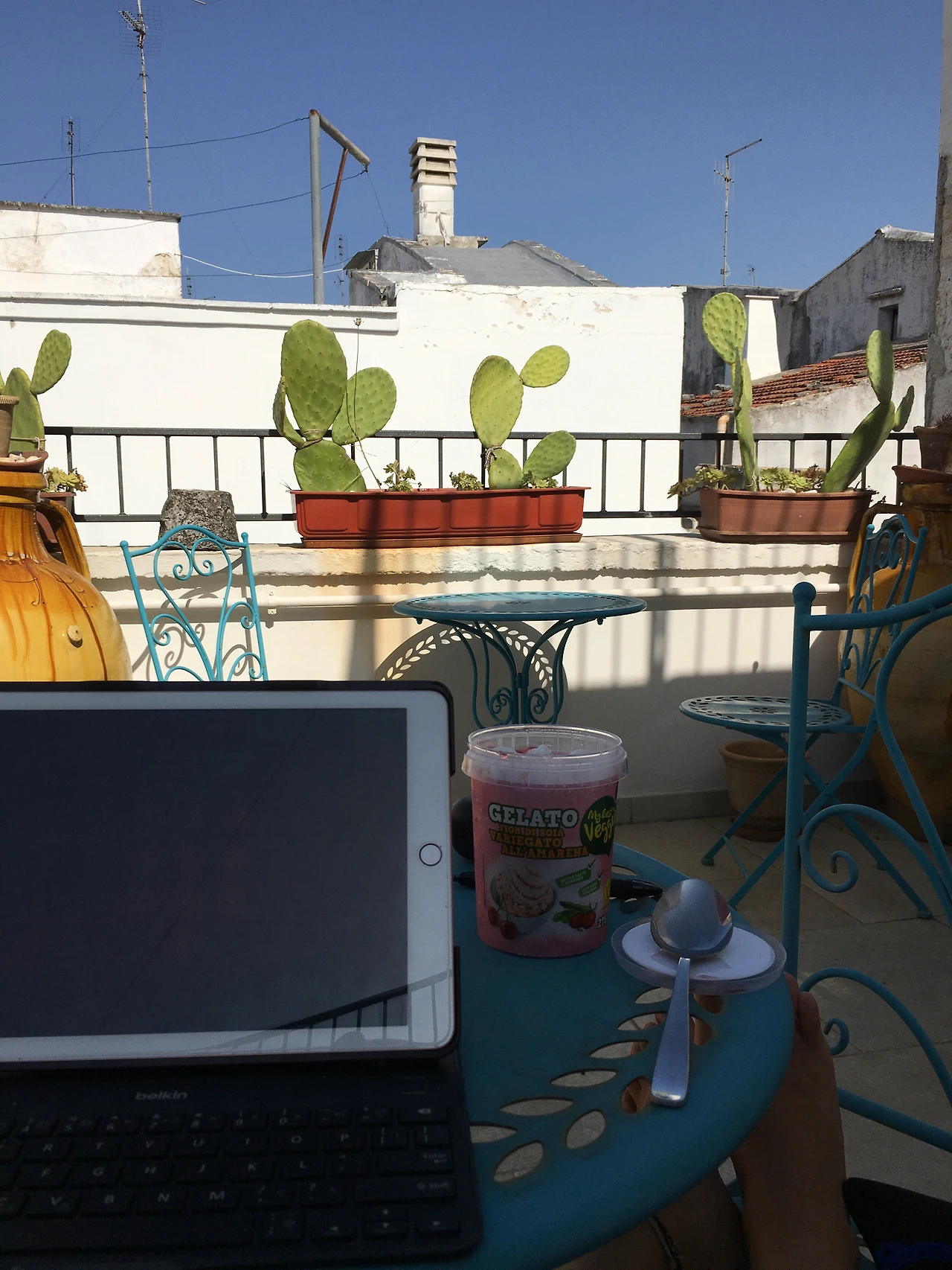 아침 내내 숙소 옮기는 일로 스트레스 받다가, 결국 두시간만에 숙소를 정했다. 1박에 인당 무려 34000원짜리. 아마 내 유럽여행 중 가장 호화로운 가격이 아닐까? (작년에 유럽을 3개월 여행할 때는 보통 만원 이하, 카우치서핑이나 친구네 집, 숙식 노동 등으로 공짜로 잤다.) 이탈리아에 왔으니 올드타운 내 특유의 하얀 돌집에서 꼭 살아보고 싶었다. 결국 에어비앤비를 한참 뒤지다가 정한 곳이 정말 작은 내륙 마을의 작은 3층짜리 이탈리아식 돌집이다. 오는 길에 카페에서 크로아상과 소이라떼를, 그리고 기차로 한시간, 작은 마을(도시라고 하기엔 마을에 가까운것 같다) turi에 도착했다.