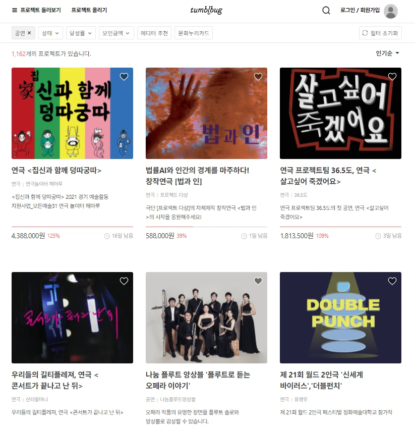 이렇게 공연을 실제로 제작하기 전에 먼저 작품의 기획 의도, 시놉시스, 로드맵, 출연진 등을 미리 제시하면, 사람들이 이에 공감하여 후원한 금액으로 공연을 제작하고 이들에게는 공연 티켓, 굿즈 등의 리워드를 제공하는 양상이다. 주로 해외 수입 뮤지컬, 대형 국내 뮤지컬을 다루는 공연기획사나 엔터테인먼트 공연은 투자처가 분명하고 자금 조달이 조금은 용이한 편이기에 이런 크라우드펀딩이 필요하지 않겠지만, 독립적인 극단, 인디펜던트 기획자나 예술가가 안 그래도 돈과 수고가 굉장히 많이 드는 공연을 하나 올리기까지 매우 유용하게 시도해 볼 수 있는 펀딩 방식일 것이다.