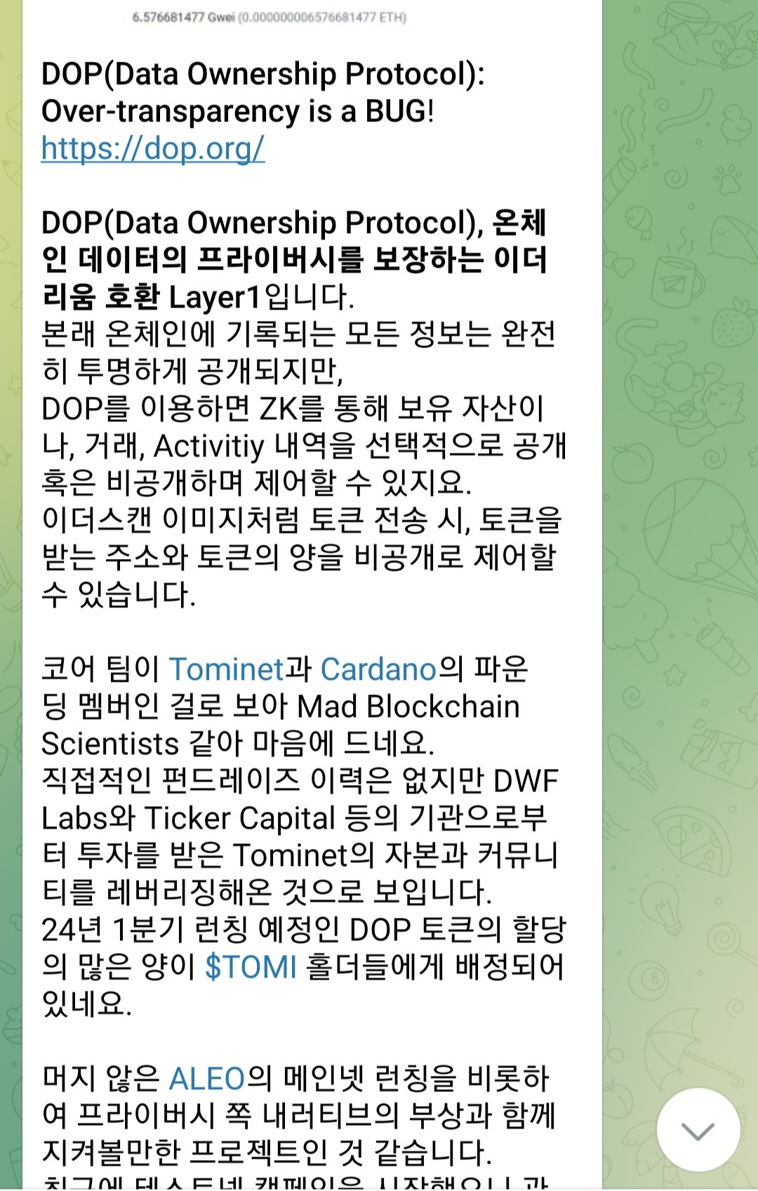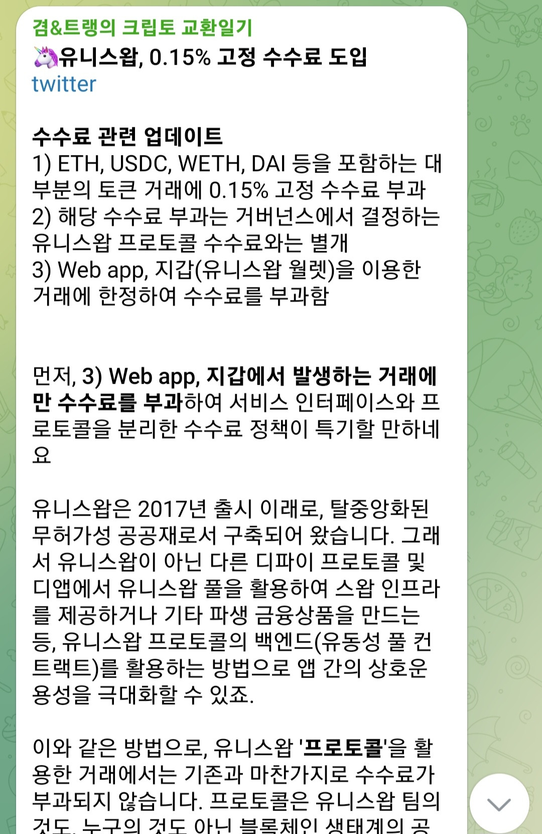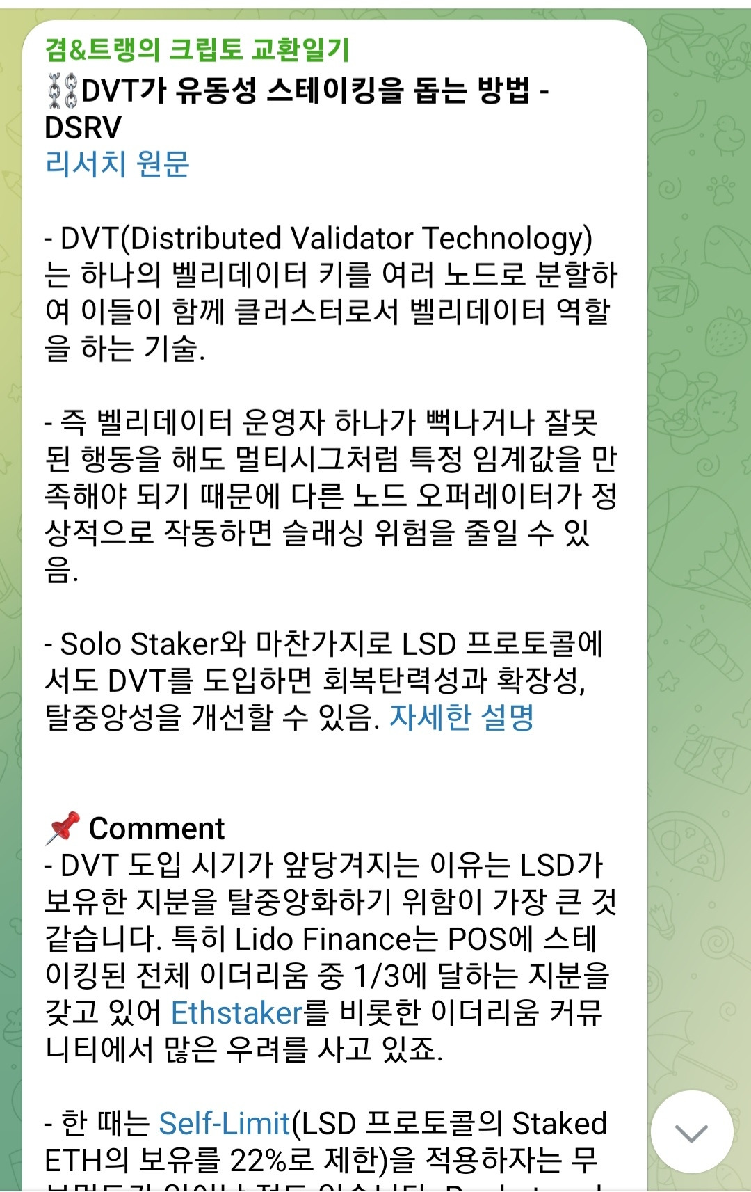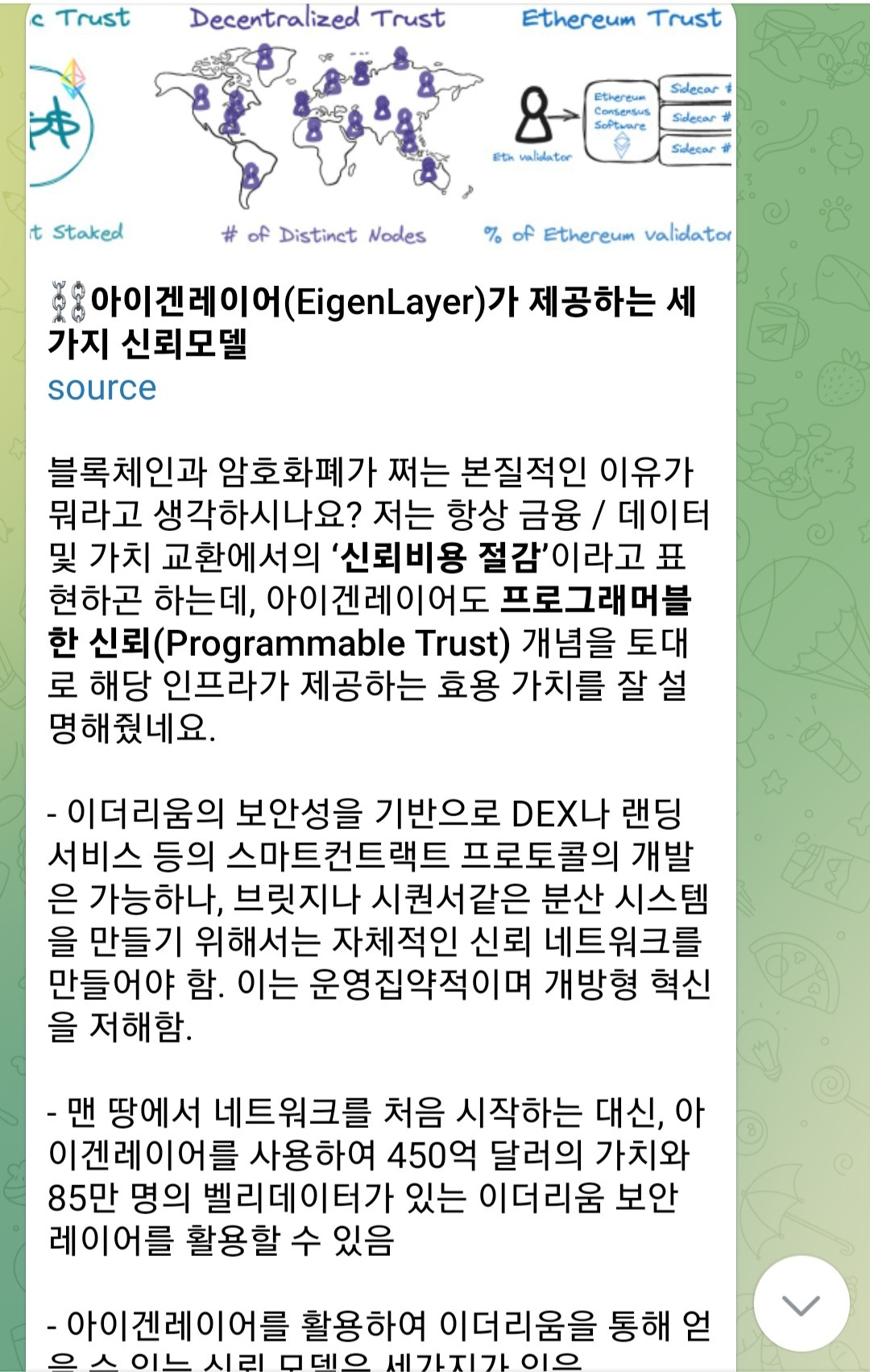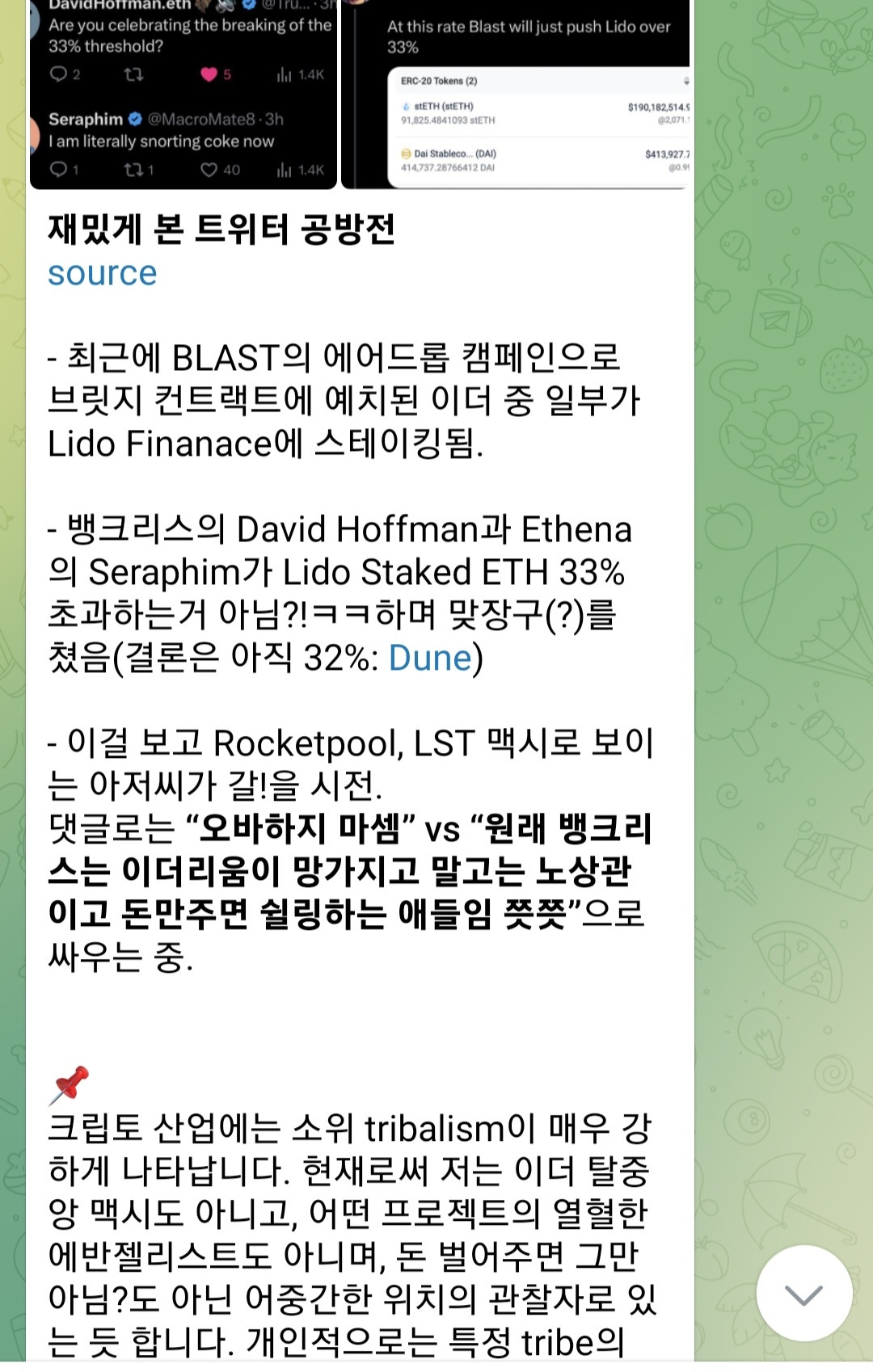 2024년의 크립토 마켓은 개인적으로도 매우 기대가 된다. 다양한 프로토콜의 런칭과 규제 상황 등으로 인해 시장 및 산업이 어떻게 변화하고 그러한 변화가 나에게는 어떠한 실익으로 작용할지에 대해 말이다. 그러한 변화를 기민하게 관찰하기 위해 꽤나 많은 정보들을 흡수하려고 노력하는 편인데, 최근에는 그 과정에서 휘발되는 정보들이 아깝다는 생각이 들어 텔레그램 채널을 운영하기 시작했다. 매일마다 인상깊게 본 리서치의 요약과 코멘트, 시장 정보 등을 올리곤 한다. 올해가 가기 전에 100명 구독자를 만들고 싶었는데, 홍보 작업을 열심히 하지 않았더니 10월에 시작한 이래로 현재 77명의 구독자로 그치게 되었다. 관심있는 분들은 들어와 주시길 바란다!(압도적 감사) 텔레그램 링크