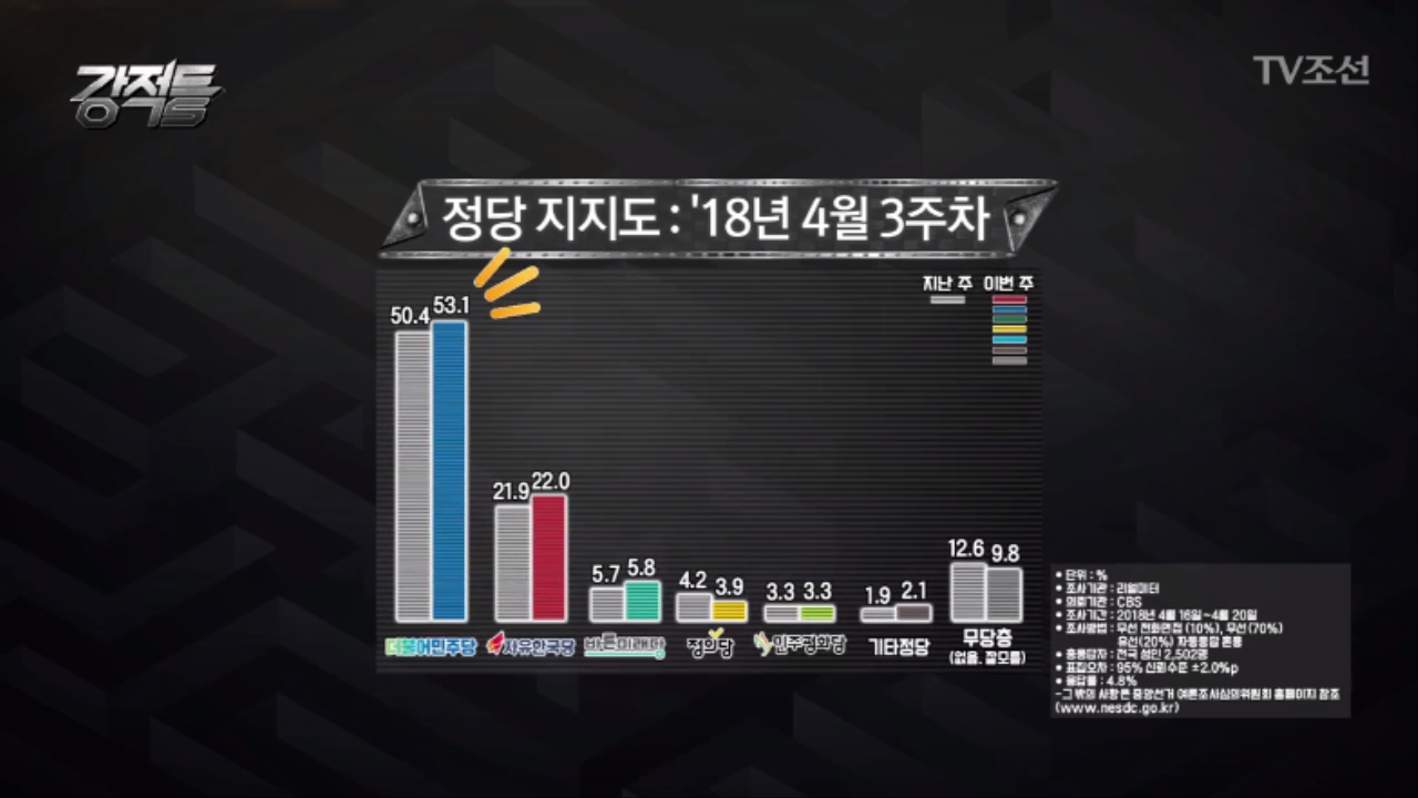 [ 6.12 지방 선거 ] 한 달여 밖에 남지 않은 시간 속에서 여당의 지지율이 물론 독보적이지만 민주당에서도 이러한 점만 믿고 나태함에 빠져서는 안 될 것이다. 드루킹 사건, 김경준 의원의 후원금 문제에 있어서는 앞서 있었던 박근혜 정부 당시 국정 농단 사건과 비교하면 굉장히 별거 아닌 문제 일지라도 현 정부는 그럴수록 더더욱 특검을 받아들이고 사건의 명명백백함을 밝혀내는 것이 중요할 것이라고 본다. 국민들이 언제까지 여당에 힘을 실어줄 수 있을지는 알 수 없다.