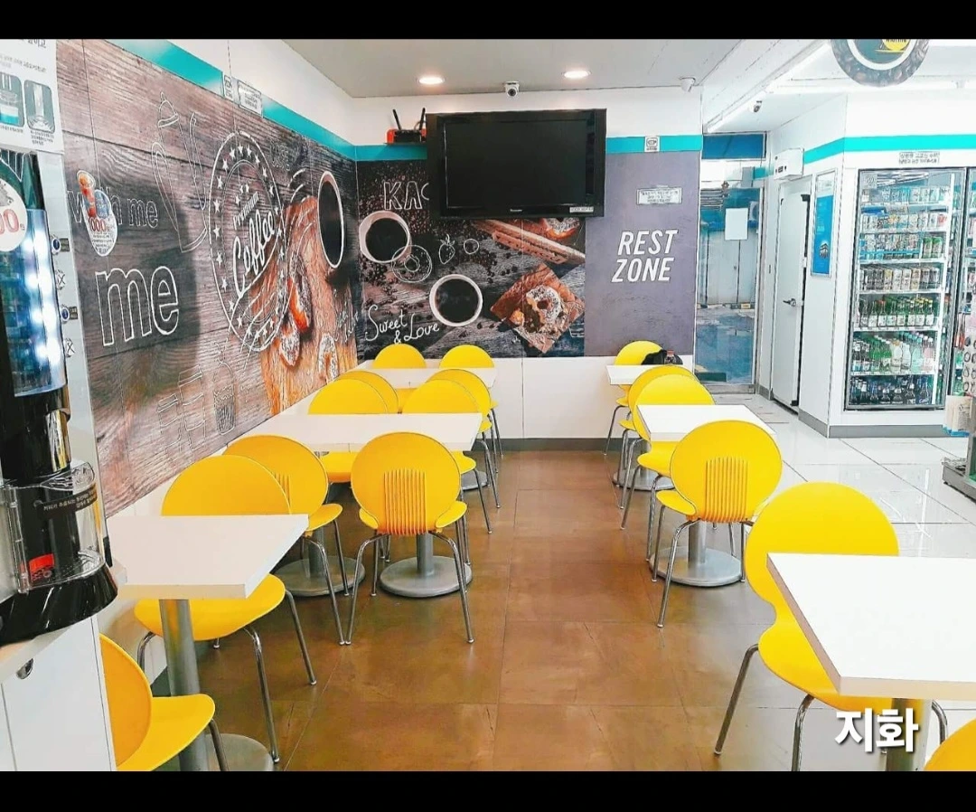 편의점 A에는 매장 안쪽에 테이블이 있고, 큰 벽걸이 TV와 커피머신도 있었다. 카운터와는 약간 떨어져 있었지만,