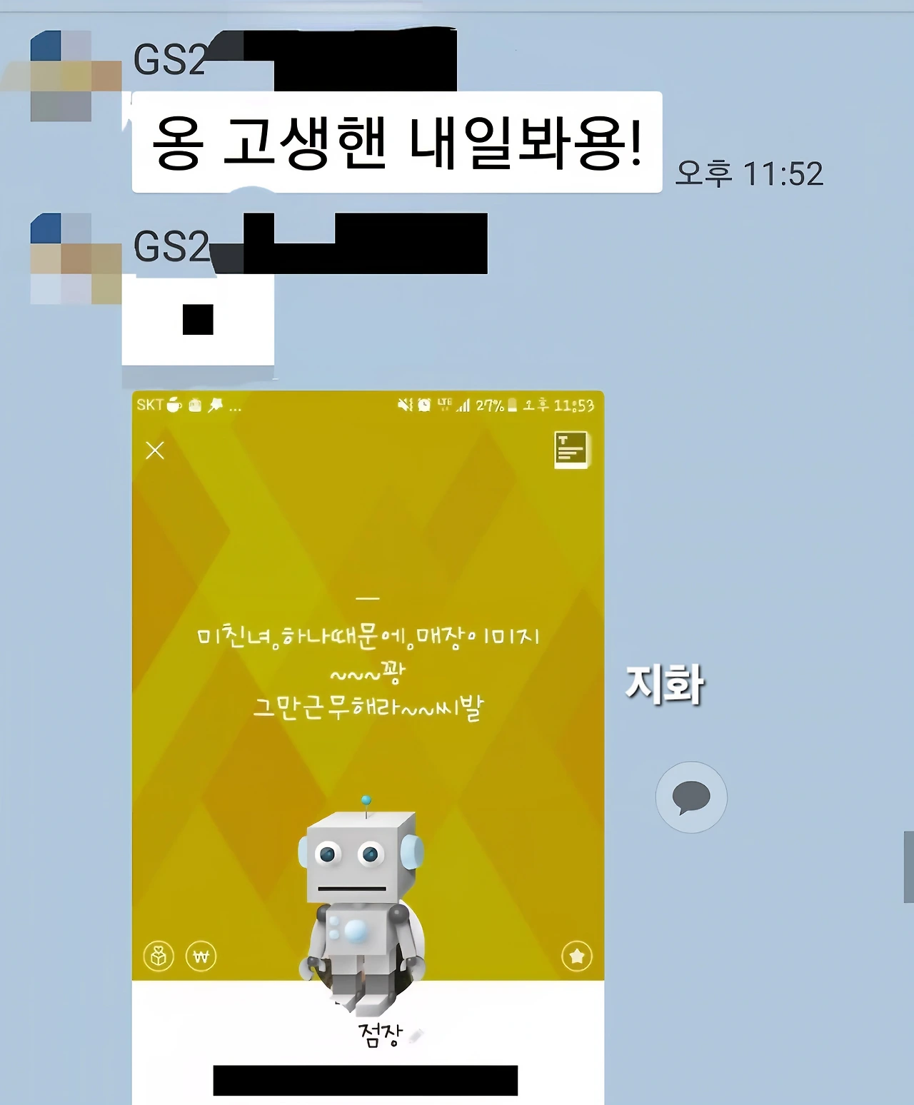 그 뒤, 동료 언니가 카톡을 보내줬다. 점장님이 날 저격한 메시지를 프로필에 해놨다는 것이다. 그리고 이후 있었던 일들을 이야기해 줬다.