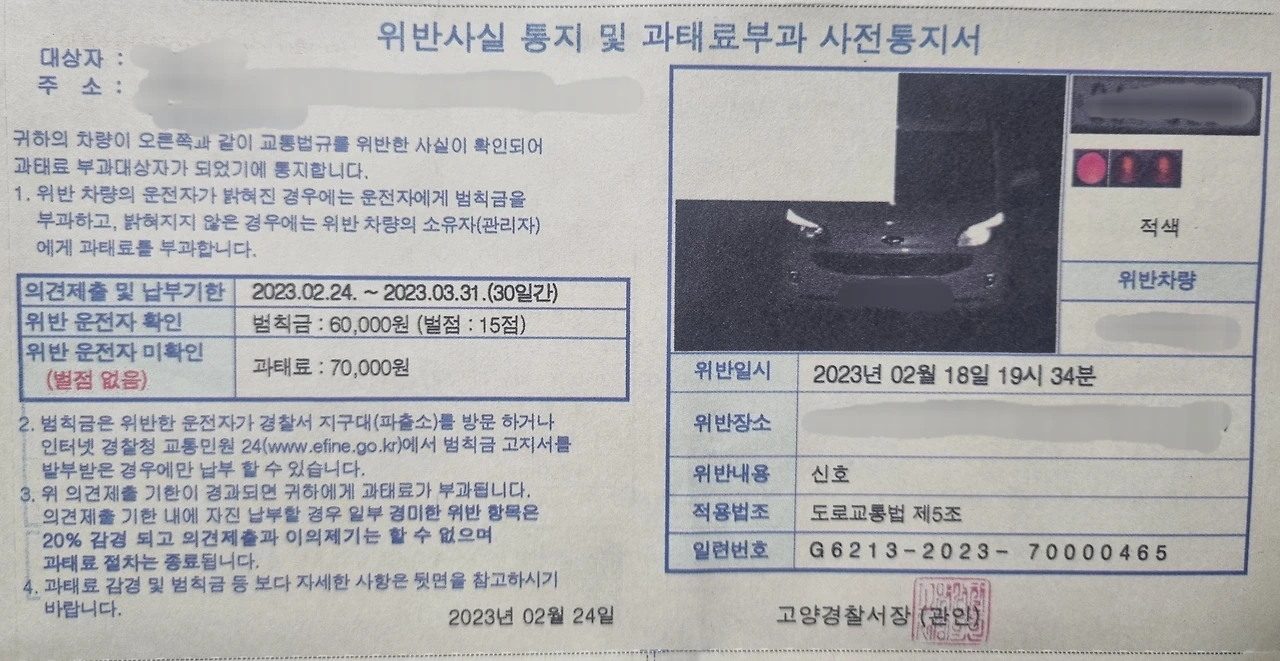 통지서를 받을 줄 어떻게 알고 파출소에 자진 방문하거나 인터넷으로 고지서를 발부받으란 말인가. 차라리 현장에서 경찰에게 적발되었으면 6만 원인데 CCTV에 걸려서 속상했다.