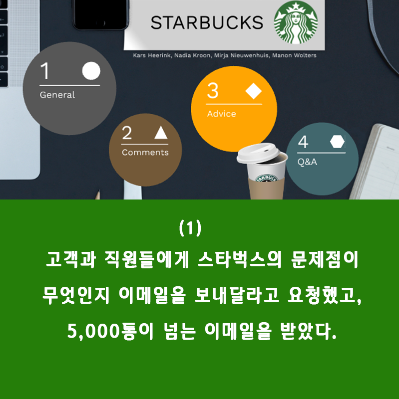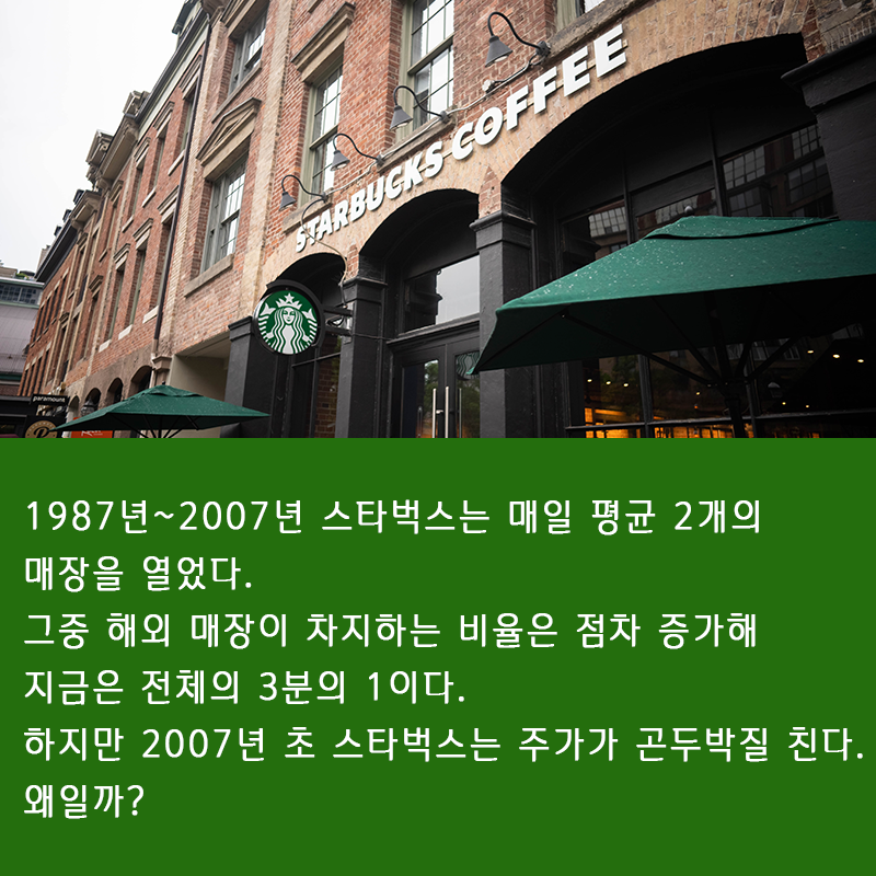 요즘 많은 회사가 코로나19로 인해 재택근무를 하고 있다. 재택근무로 대체해도 일이 진행되어 한편으로 다행이다. 그로 인해 붐비는 곳이 있는데, 그곳은 스타벅스다. 깔끔하게 놓여있는 테이블과 의자, 통일된 실내장식으로 편안한 분위기를 조성하고 알맞은 음악까지 흐르는 스타벅스는 커피를 마시러 간다기보다 영감을 얻으러 간다고 해도 과언이 아니다. 스타벅스는 실제로 커피를 파는 일을 하는 것이 아닌 영감을 북돋는 사업을 한다는 것이 사명이라고 한다. 하지만 전 세계인의 사랑을 받는 스타벅스에게도 암울했던 시절이 존재했다.