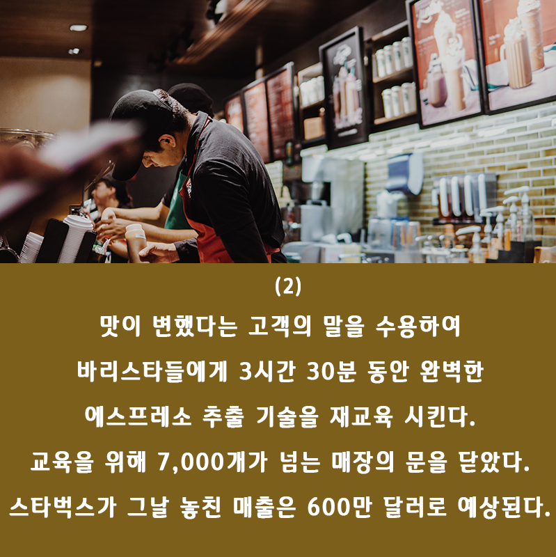 결국 스타벅스는 초심으로 돌아가 조직을 정비하고 행동 기준을 다시 찾기까지 꼬박 2년이 걸렸다. 자리에서 물러났지만, 이사회의 요청으로 다시 CEO직을 맡은 하워드 슐츠는 단기적 이익이 아닌 장기적으로 고객들과 지속적인 관계를 유지하기 위해 노력했다. 절대 한 가지의 방법으로 고객의 마음으로 돌릴 순 없다. 하워드 슐츠가 실행한 많은 방법 중 인상 깊은 몇 가지는 아래와 같다.