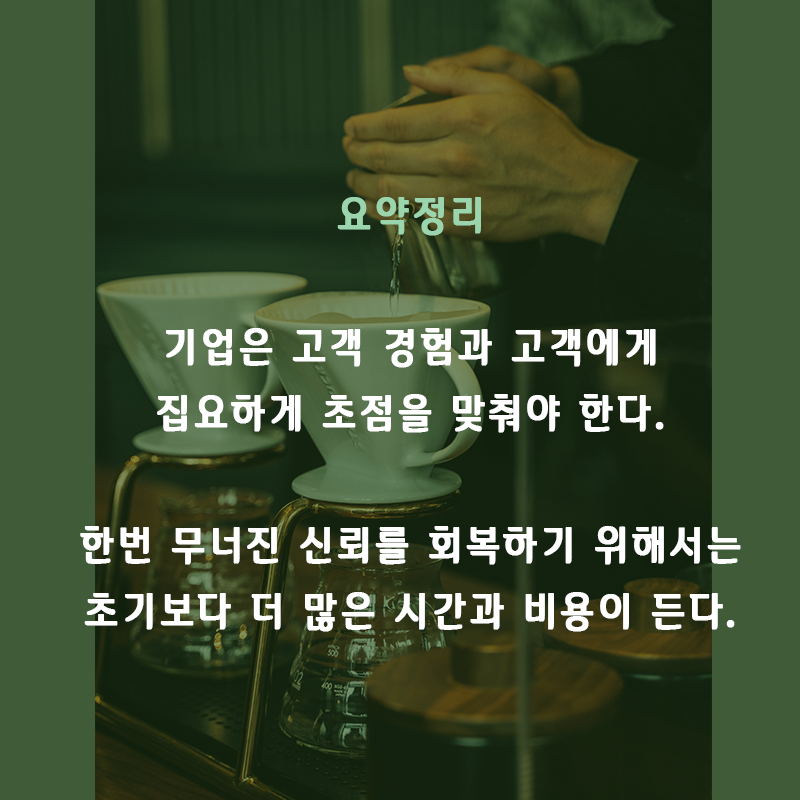 2010년 스타벅스는 15만 명을 고용하고 100억 달러 이상의 매출을 거두며 성장 저하를 극복한다. 과거의 일을 교훈 삼아 어느 때보다 탄탄하게 기반을 다질 수 있었다. 스타벅스 사례를 통해 고객과 지속적인 관계를 유지하고 장기적인 성공을 위해선 사업확장보다 고객 경험이 먼저라는 것을 배울 수 있다. 같은 실수를 반복하는 기업이 없길 바란다.