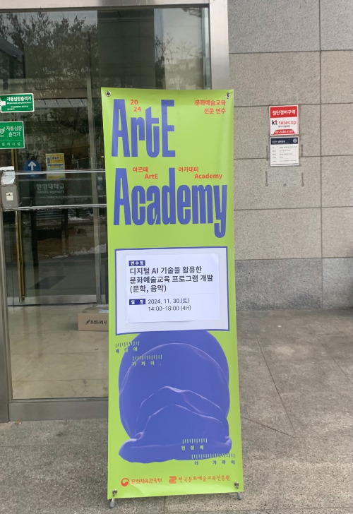 이는, 얼마 전 11월 30일에 열렸던 ‘2024 아르떼 아카데미’에서 “디지털 기술을 활용한 문화예술교육 프로그램 개발(문학, 음악) - 행동변화를 이끄는 문화예술교육의 확장 : 디지털 헬스케어/AI 활용 가능성”을 주제로 한 집체 연수 과정이다.