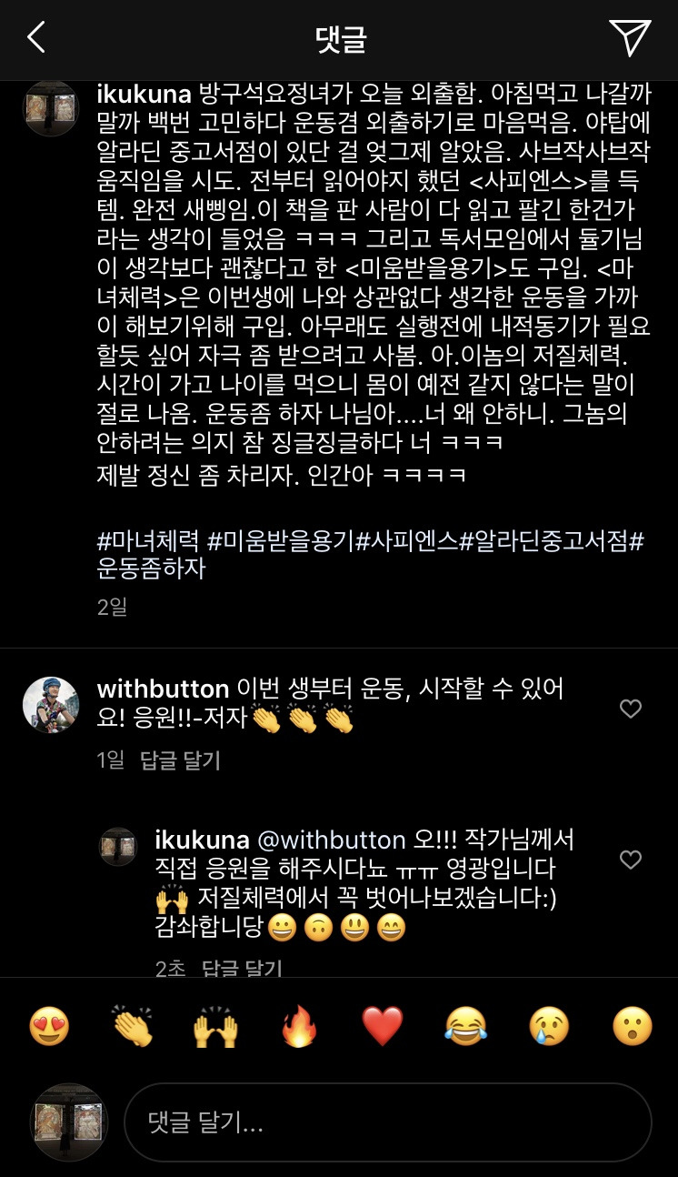 그런데 이 말은 이제 나에겐 틀린 말이 되어버렸다. 작년부터 독서와 글쓰기를 시작해 지금까지 해오고 있는 나를 보며 알게 되었다. 독서와 글쓰기를 시작하는 건 분명 힘들었지만 의식적으로 반복하다 보니 어느새 삶의 일부가 되었었고 도전하고 싶은 것들도 생기기 시작했다.