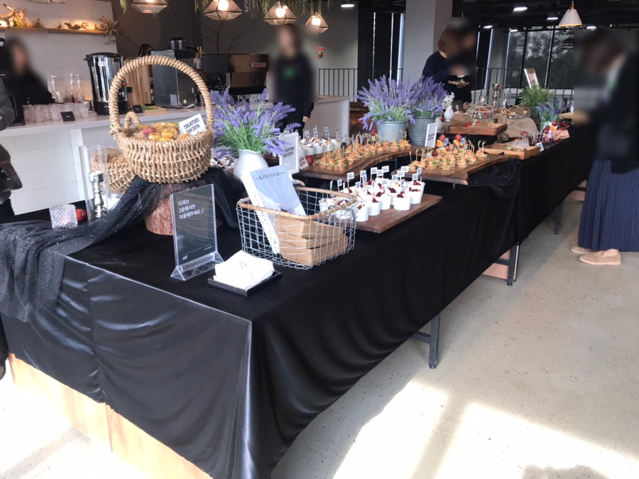 오후 1시 30분 터 입장이 가능한지라 일찍 도착한 우리는 간단히 점심을 먹고 행사장에 들어갔습니다. ' 우와~쫌 차려놨네 여기~' 결혼식 뷔페라도 온 것 같이 정성스레 차려진 다과 테이블을 보고 입이 떡 하니 벌어졌어요. 이렇게 정성스럽게 준비를 해놓다니. 이게 바로 자본의 힘인 것인가?라는 생각이 잠깐 스쳐 지나갔죠. '카카오에서 준비하는 거라 돈 좀 썼네 썼어. 역시 있는 자의 여유로움이란. 난 그냥 마음껏 즐기기만 하면 되는구나. 유훗!' 카페처럼 커피와 음료를 준비해 놓은 공간, 다과를 편하게 즐기라고 스탠딩 테이블과 아래 강연장이 내려다 보이는 곳에 계단식 좌석도 마련해 두어 행사가 시작되기 전 크리에이터스 2019의 기분을 미리 즐기기에 충분했습니다.