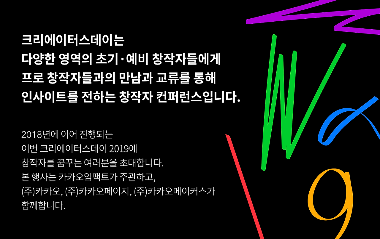19년 10월 18일 오후 5시 언저리. 곧 퇴근이니 좀 만 버티자며 지친 나를 달래고 있던 찰나. 전화벨이 울렸다. "여보세요" "네 안녕하세요 000님 맞으신가요? 크리에이터스 데이 26일에 오시는 거 신청하셨죠?" 뭐지? 내 귀를 의심했다. 헛소리가 들리나 싶어 귓가에 대고 있던 전화를 잠시 떼었다 다시 갖다 댔다. 크리에이터스데이 2019 운영사무국이란다. 오마낫.세상에.여차저차 해서 참가 인원을 더 뽑게 되었으며 거기에 내가 포함이 되었다. 와우! 웬일이래~! 대박일세!! 크핫! 참석할 수 있냐는 말에 친구와의 약속은 홀라당 잊어버린 채 "그럼요! 갈 수 있어요! 일행도 있어요!"라고 냅다 대답했다. 전화를 끊고 혼자 좋아라 하고 있다 문득 친구와 한 약속이 떠올랐다.