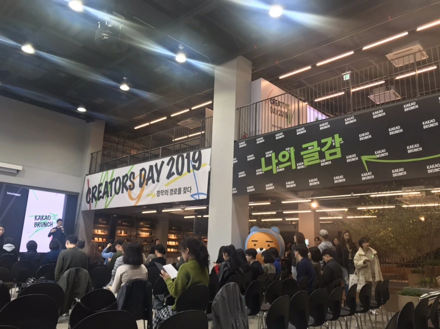 행사장 서가에는 브런치에서 배출한 출간 작가님들의 책들이 전시되어있었고, 앞서 진행되었던 카카오페이지, 웹툰, 이모티콘 등에 관련된 작품들이 전시되어 있었어요. 카카오에서 새로운 크리에이터를 발굴하기 위해 많은 것을 투자하고 있다는 것이 느껴졌습니다. 아직 다듬어지지 않은 원석들을 발굴해 다이아몬드로 만들어 가는 과정을 카카오에서 적극적으로 지원하고 있다는 사실이 새삼 놀라웠습니다.