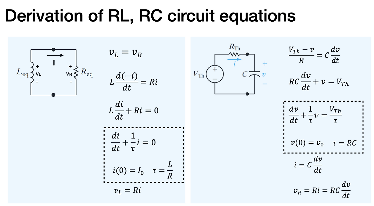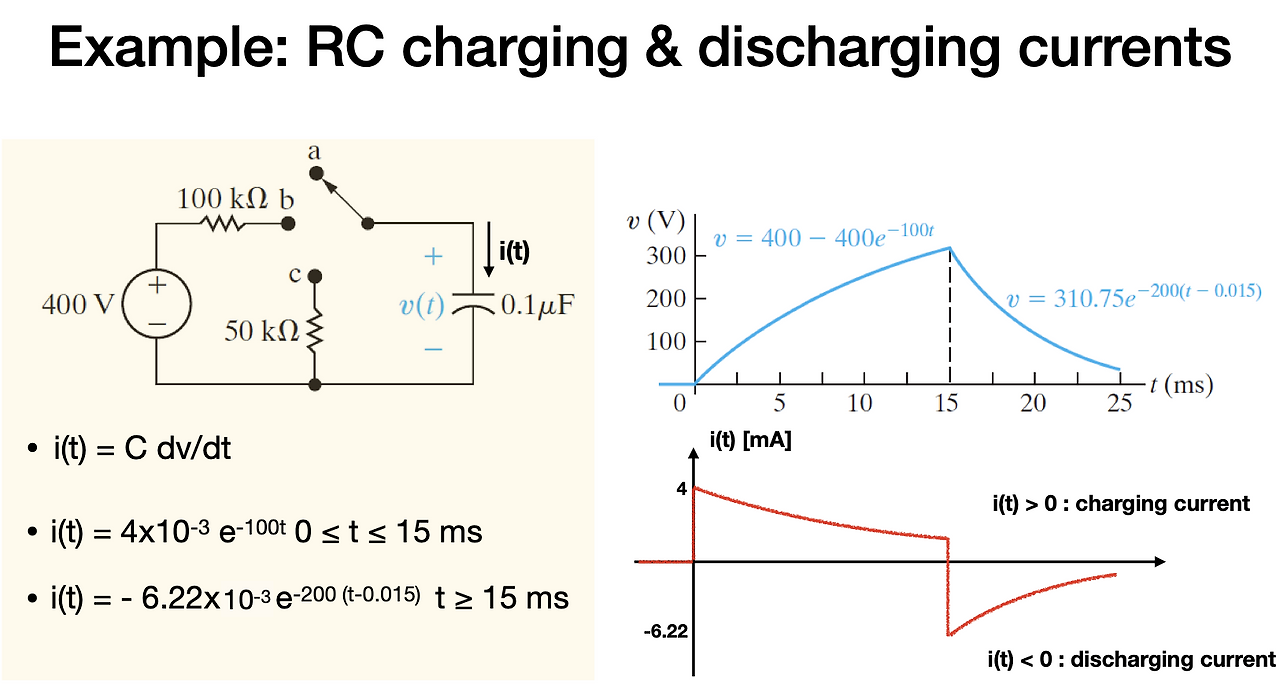 위 식은 전압이 시간이 지남에 따라 지수적으로 감소하는 것을 보여줍니다. 고등학교에서 배우는 지수 함수와 미적분이, 전기 회로의 설계와 분석에서 실제로 사용되는 것을 학생들에게 직접 보여줍니다. 이 내용을 직접적으로 설명하지는 않습니다. 제가 보여주고자 하는 것은 미분과 적분이 실제로 어떻게 쓰이는 지를 보여주고자 한 것이지요.