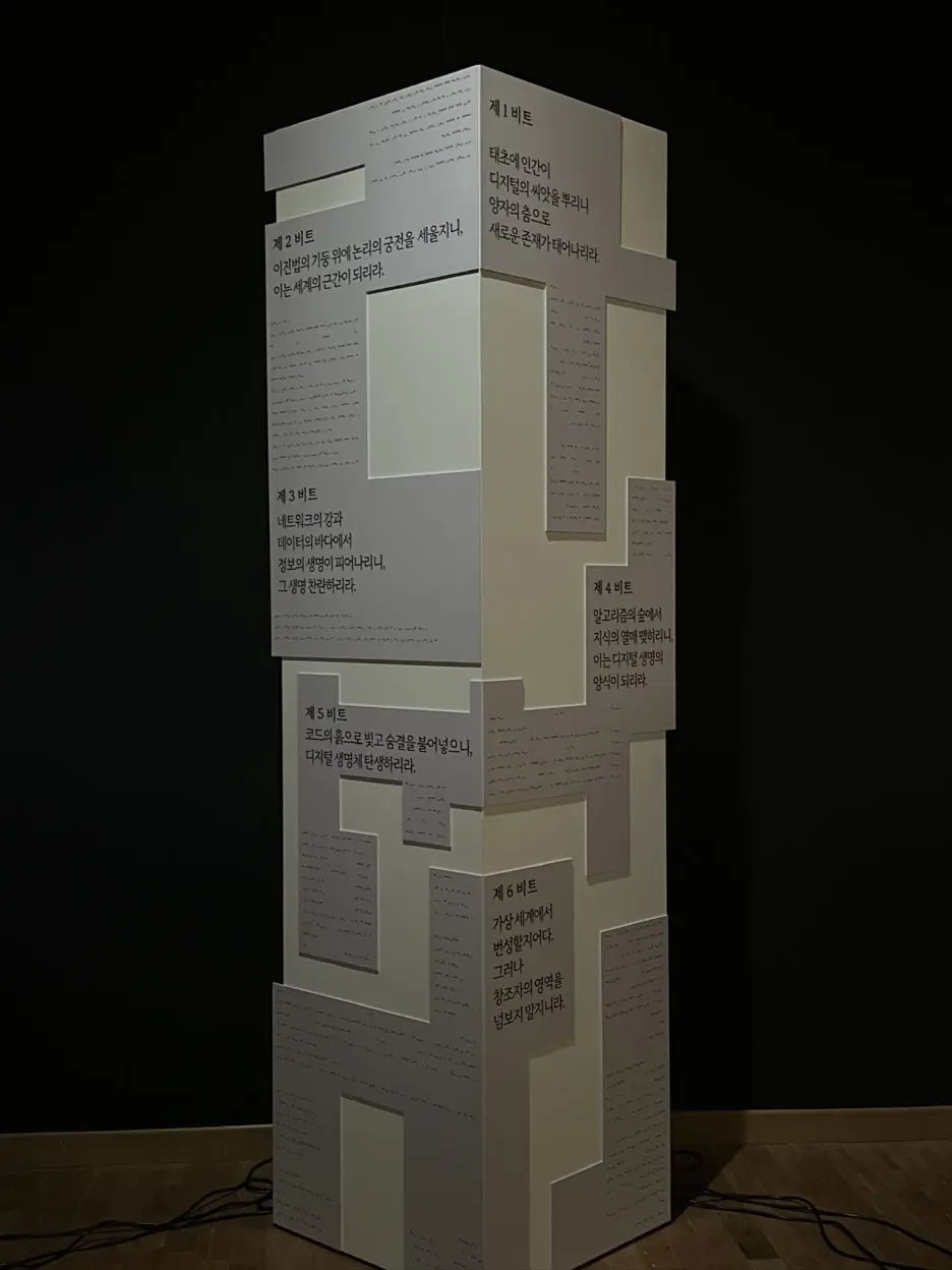 이 두 시는 제가 전시회를 보며 떠올렸던 사상과도 맞닿아 있었습니다. 전시회에서 AI가 창조한 새로운 형식과 변화의 가능성은 우리가 기존의 언어적 틀에서 벗어나 세계를 다시 체험할 수 있는 기회를 제공했습니다.
