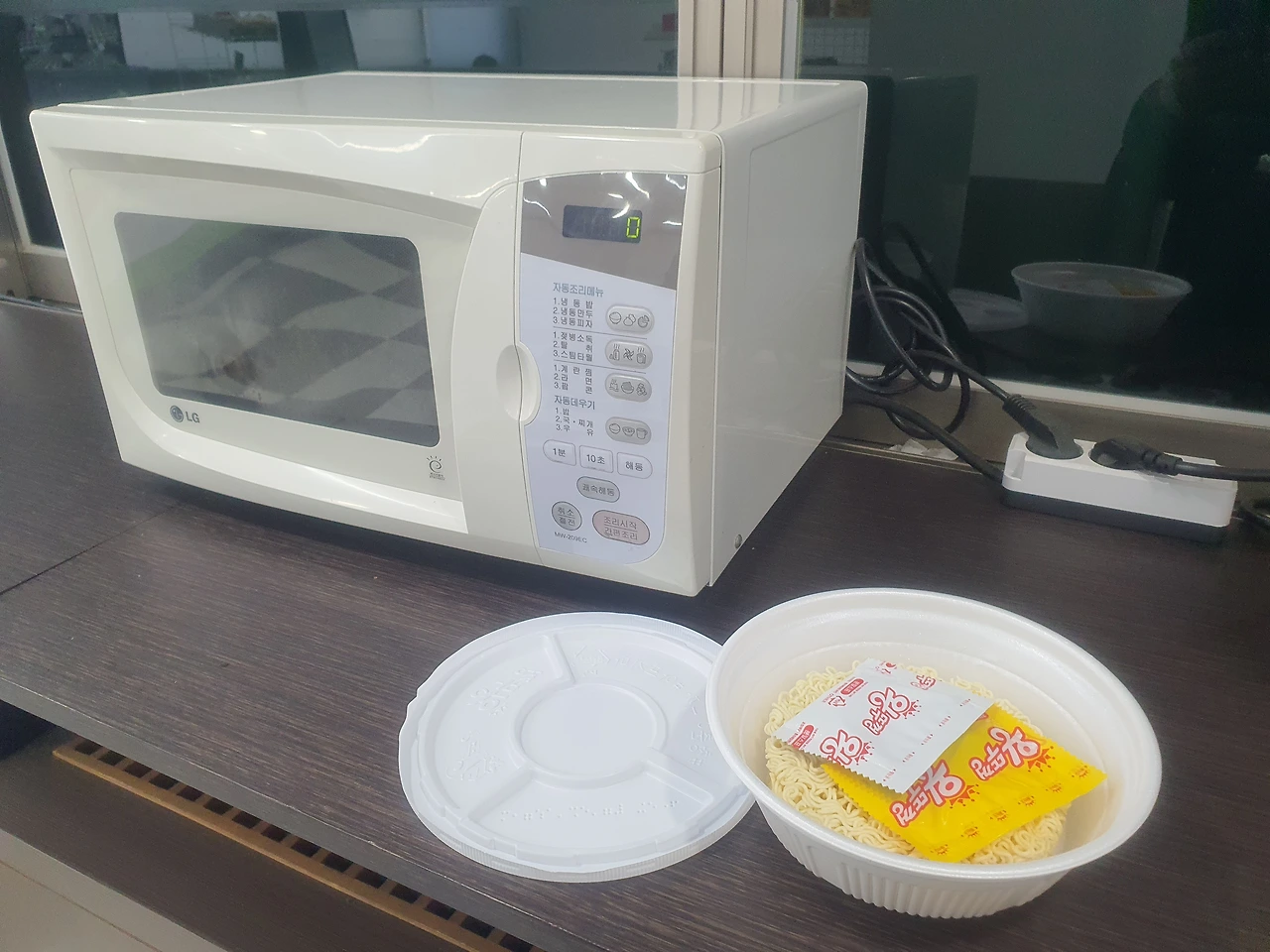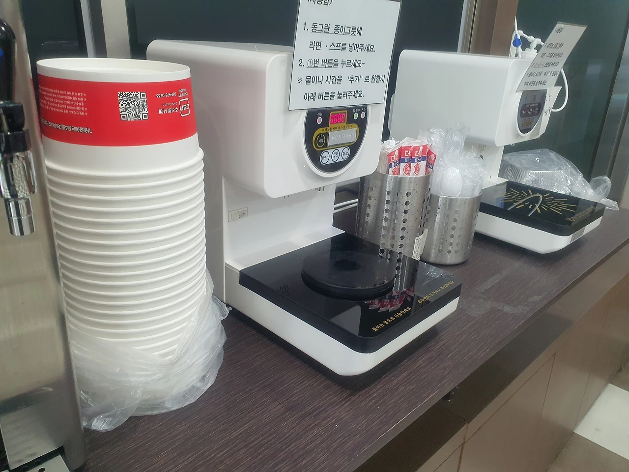 라면용 종이컵도 흰 색이고, 라면 끓이는 기기는 하얗 색이다.