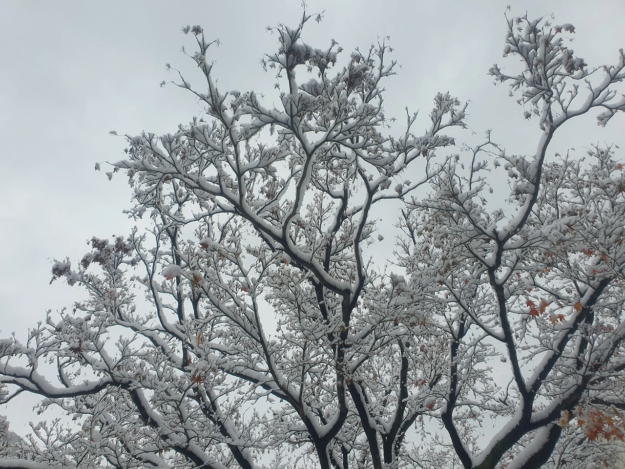 나뭇가지에 쌓인 눈도 흰 색이다.