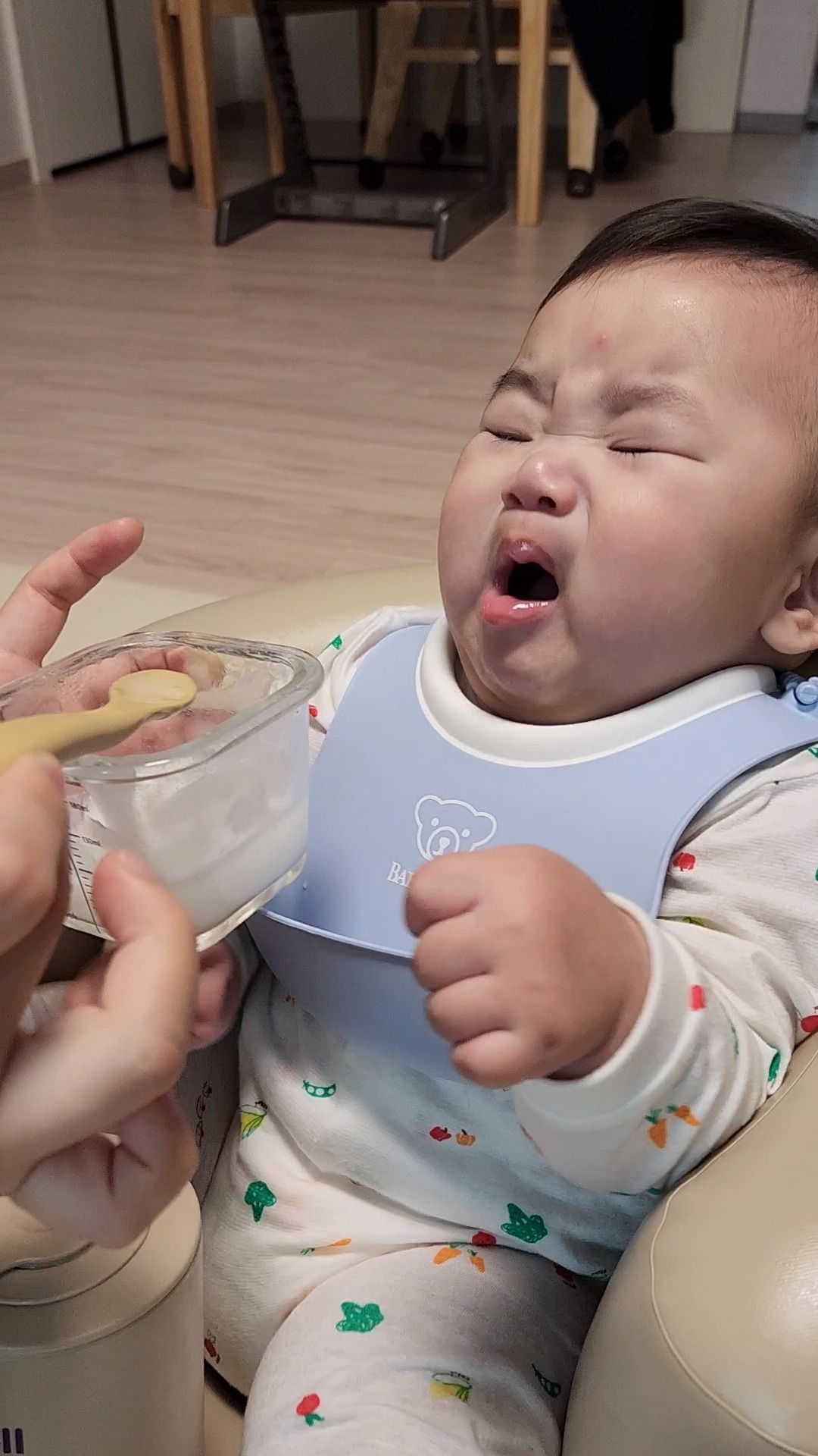 낯선 이유식의 습격에 당황한 아들, 오만상을 지으며 고개를 뒤로 젖혀 버렸다.