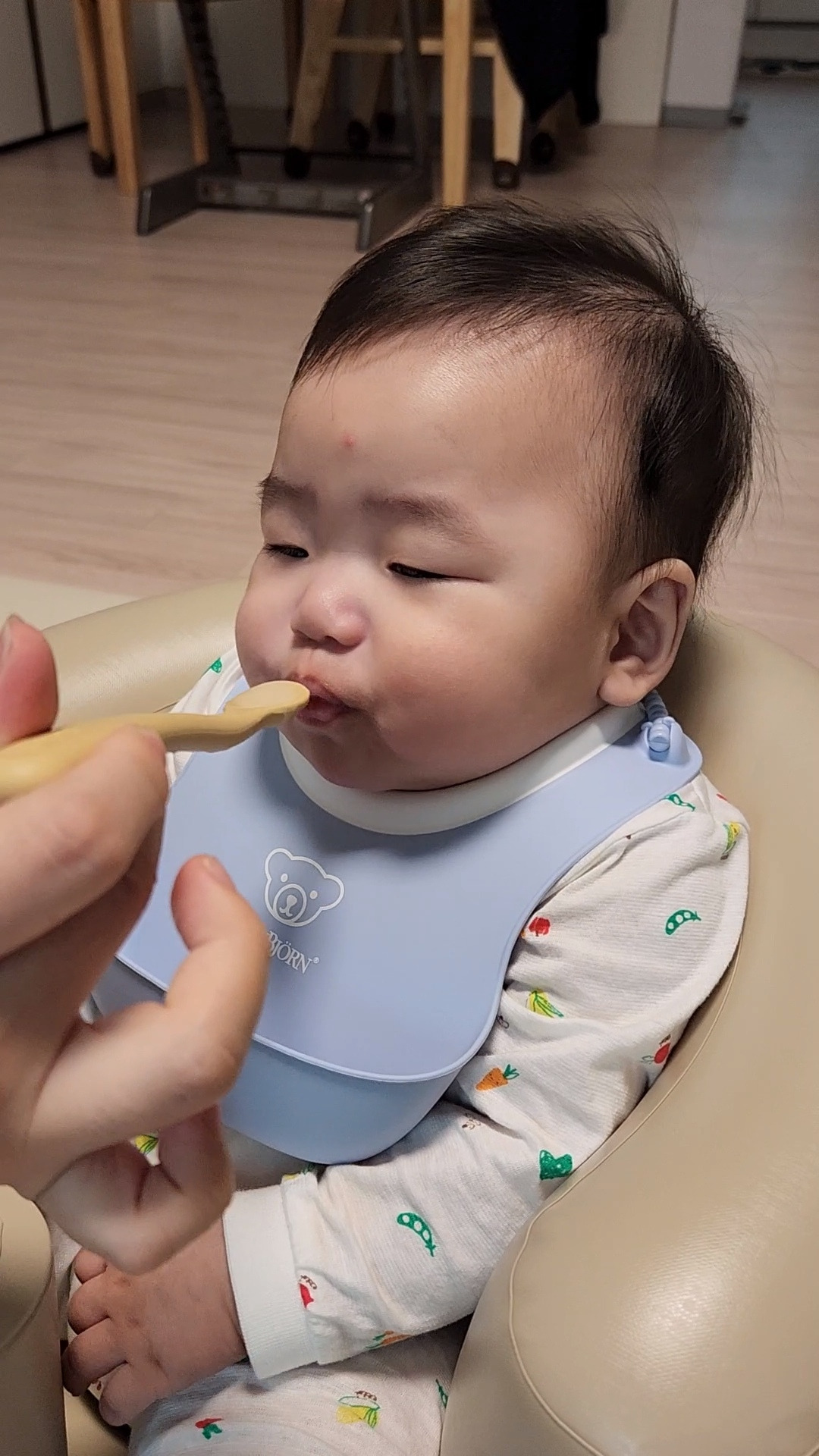 그래도 도전은 계속됐다. 다행히 하루하루 지나니 아들은 조금 적응한 모습이었다. 숟가락의 입안 침공엔 여전히 불쾌한 기색을 드러냈지만, 이유식 자체는 먹을만한지 하며 입을 '옴뇸뇸'하며 상하좌우로 움직였다. 젖병 젖꼭지만큼 편하게 먹진 못해도 새로운 음식을 받아들이는 것이 조금 익숙해진 것 같았다. 아내와 나는 서로 바라보며 한시름 놓았다는 표정을 지었다.