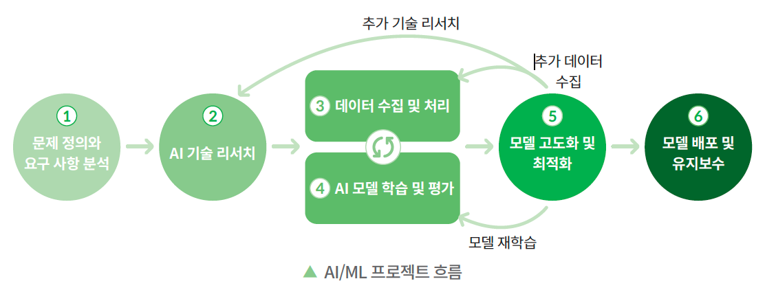 AI/ML 직군의 업무는 복잡하고 다층적이며, 문제를 해결하는 과정에서 단계별로 나뉜 다. 지금부터는 이러한 업무를 단계별로 소개하려 한다. 다만 여기서 설명하는 단계들 은 AI/ML 엔지니어가 수행할 수 있는 전체 사이클을 포괄적으로 설명한 것으로, 모든 엔지니어가 이 모든 단계를 다 수행하는 것은 아니다. 실제로는 단계별로 역할이 세분 화되거나 회사나 프로젝트의 성격에 따라 업무 범위가 달라지기도 한다.