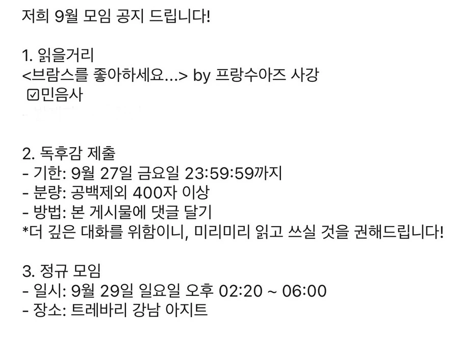 모의 트레바리를 해보자는 제안은 생각보다 재미있게 느껴졌고, 나는 망설임 없이 수긍했다. 그날 함께한 사람들과 단체 카카오톡 대화방을 만들었고, 자연스럽게 첫 책이 정해졌다. 우리가 처음 함께 읽은 책은 『브람스를 좋아하세요?』였다. 트레바리 독서 모임에는 반드시 지켜야 하는 규칙이 하나 있다며, 진지한 표정으로 이야기를 꺼냈다.