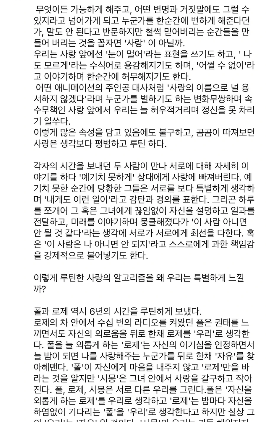 9시부터 6시까지 이어지는 평범한 직장인인 나의, 삶은 평탄하고, 무난하고 단조로웠다. 워라밸이 보장된 회사 덕분에 저녁 6시면 꼬박꼬박 퇴근할 수 있었다. 퇴근 후에는 달리기를 하거나, 책을 읽으며 조용히 시간을 보냈다. 평탄하고 단조롭고 무난한 일상은 특별히 불만은 없었는데 어쩐지 허전했다.