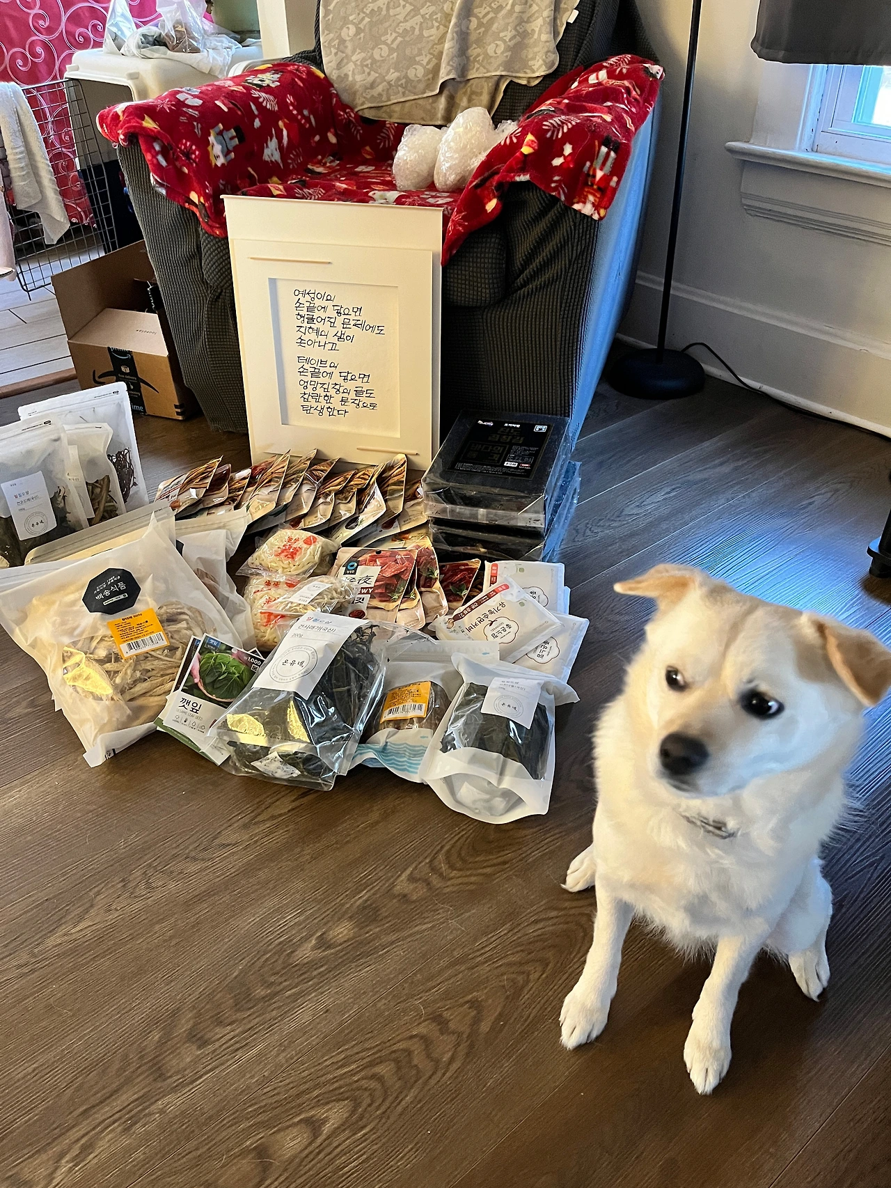 아빠의 큰 판넬시화를 걷어내니, 동생의 선물들이 눈에 들어오기 시작했다. 여기서 내가 육개장을 만들면 고사리랑 토란이 없어서 그 맛이 안 난다고 했더니, 마른 고사리랑 마른 토란, 다른 마른 나물들을 엄청 보냈다. 예전에 동생이 보내준 노가리랑 맥주 한잔이 정말 천국 같았다고, 을지로 오비맥주 마시는 느낌이었다고 얘기했었는데, 그걸 기억했나 본지 온갖 건어물을 다 보냈다. 먹태, 쥐포, 진미채 오징어 등. 정말 귀신 들린 듯이 나는 딱 보고 바로 뜯어서 다 하나씩 와구와구 먹기 시작했다. 정말 절대 미국에서는 찾을 수 없는 맛, 건어물 맛.