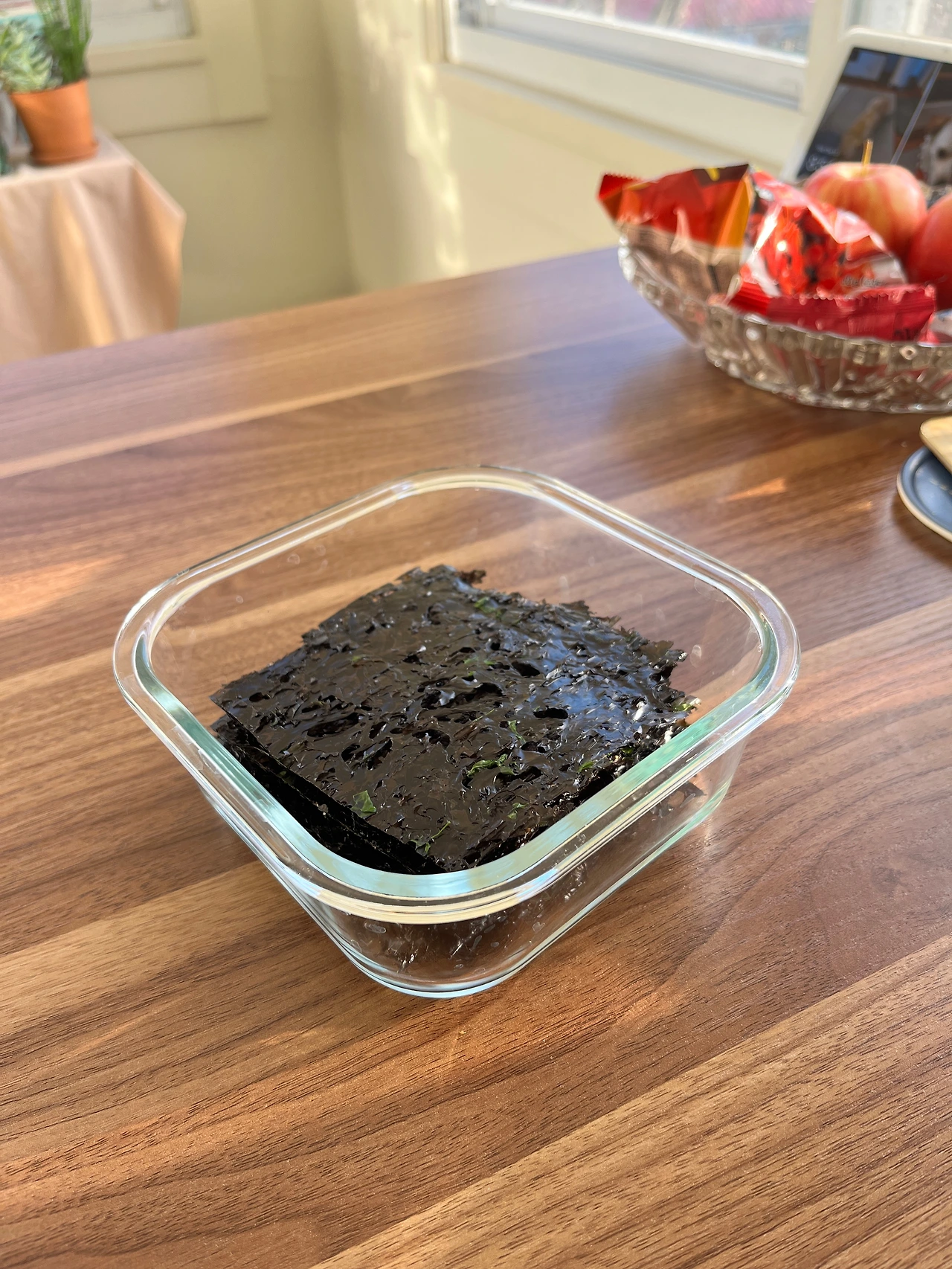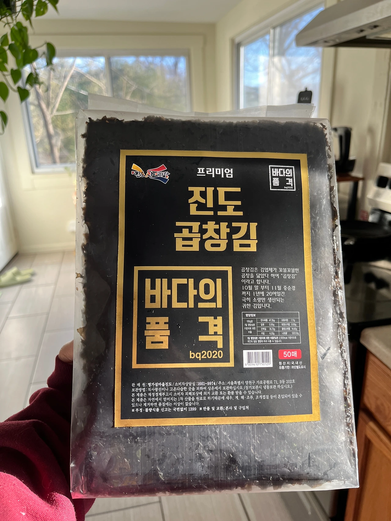 그리고 마지막으로 두꺼운 사전 같은 게 뭔지 보니, 엄마가 직접 샀다는 곱창 김이었다. 보니까 또 시장에서 파는 게 아니라 진짜로 비싸게 파는 곱창김을 넣었다. 미국에서는 조미김만 팔고, 김밥김도 참 저퀄리티 김이라 곱창김이 너무 그립다고 엄마한테 말했었는데 저 두꺼운 곱창김 사전을 두 개나 보냈다. 하나는 냉동실에 넣고 하나는 열어서 예전에 우리 아빠가 하던 것처럼 유리통 사이즈에 맞게 고이 잘라서 넣었다. 김이 정말 고퀄 김이었던 게, 너무 두꺼워서 아주 조심스럽게 잘라야 했다. 통에 쌓인 김을 흡족스럽게 보고 하나를 입에 넣고 오물오물 김 맛을 봤다.