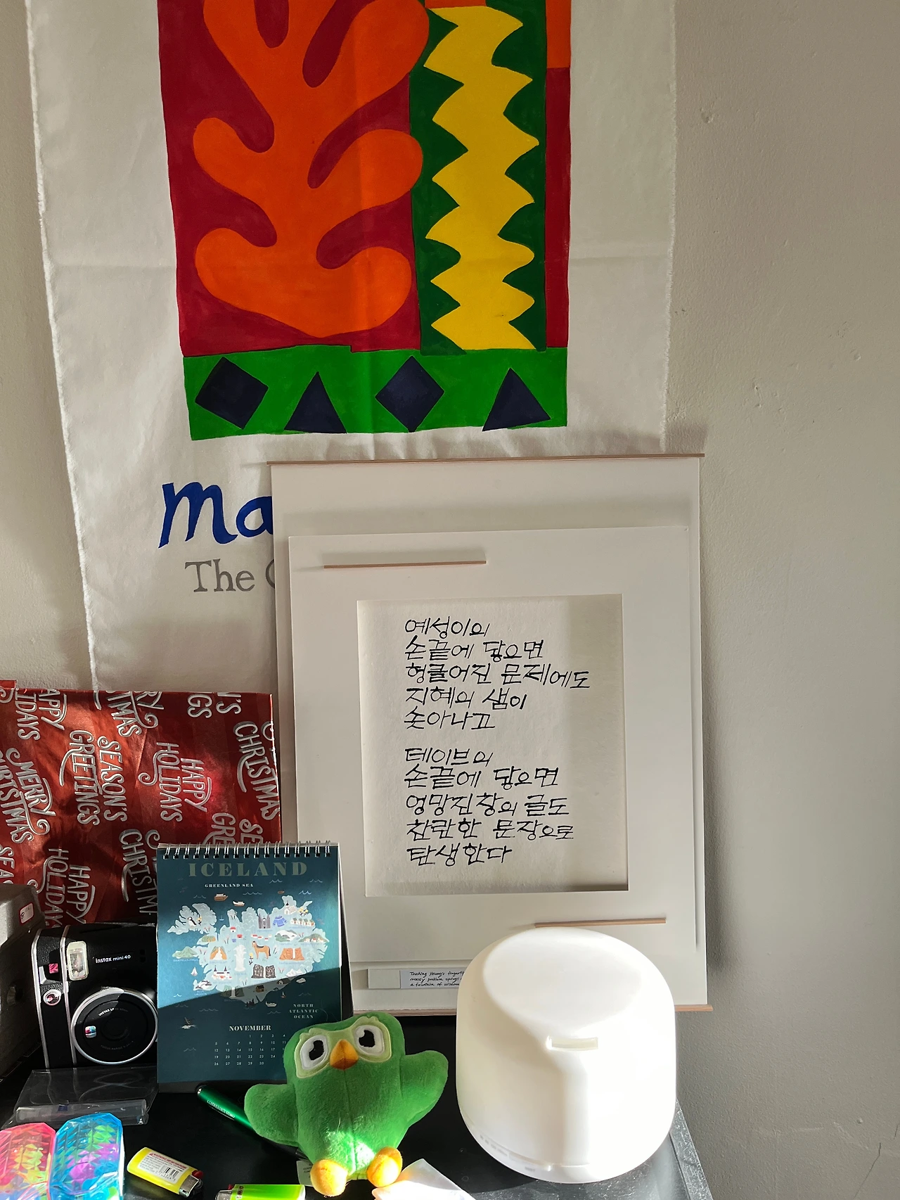 한 30분이 지난 후 나는 마음을 가다듬고 소포상자를 열었다. 미국 생리대가 너무 거칠다고 말했던 걸 동생이 기억했는지 위에 한국 생리대가 있었고, 역시 한국인스럽게 생리대는 생리대만의 역할을 하고 있지 않았다. 상자 안이 찌그러들지 않게 완충재의 역할도 하고 있었다. 수많은 생리대를 다 걷어내니 아빠의 친환경 예술작품이 나를 맞이했다. 우리 아빠는 주변에 보이는 재활용품을 활용에서 업사이클링으로 작품을 만드는 게 취미신데, 이번에는 우리 부부에 대한 시를 써서 시화를 만드셨다. 나는 아빠의 이런 감성충만한 작품이 참 좋다. 재활용품이라 그런지 아빠의 잔소리도 같이 들린다. 일회용품 자제하자, 지구를 위해서는 우리가 바뀌어야 한다, 등.
