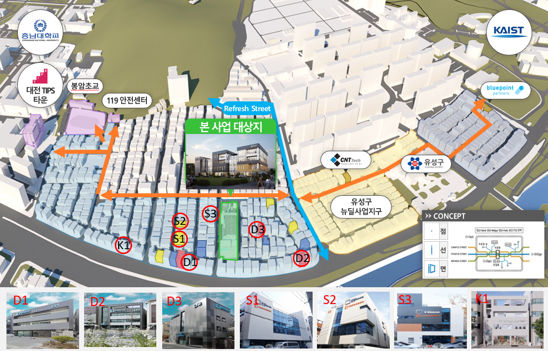 ‘대전창업열린공간’이 앵커역할을 수행할 궁동 창업혁신타운에는 이미 7개의 부속건물이 곳곳에 분산 배치돼 있다. ‘창업거리’ 조성을 위해 2020년 개소한 D1과 D2를 시작으로 그 이듬해 문을 연 D3가 그 선도적 역할을 했다. 디브릿지 3개동에 현재 15개 창업기업과 벤처투자사 4개 등이 입주해있다. 이어 신한금융그룹이 총 1,000억 원의 기금을 조성, 청년창업을 위해 투자하기로 대전시와 협약을 체결했다. 이 가운데 현물투자 200억 원으로는 충남대와 카이스트 사이 부동산을 매입, 스타트업과 투자사를 입주시키는 계획을 순조롭게 진행하고 있다. 지금까지 5개 건물을 매입해 허문 뒤 S1, S2, S3 3개동의 신한스퀘어브릿지를 지어 운영 중이다. 이곳에는 현재 12개의 기업이 입주해 있다.