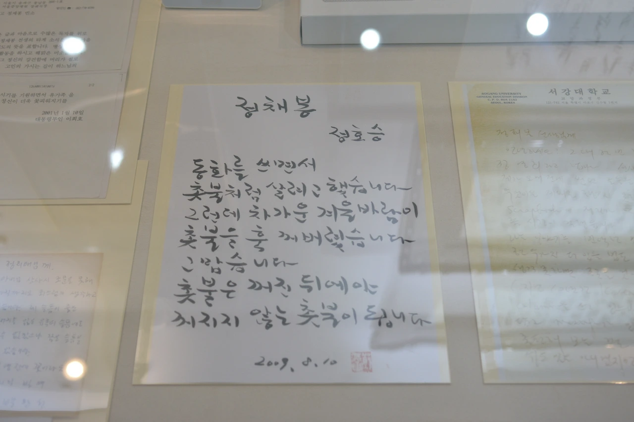 정호승 시인의 정채봉을 추모하는 글과 그의 친필 일기들, 그리고 그의 책과 작업실과 신문 스크랩 등등 다양한 자료가 많았고, 특히 다양한 분들과의 교류가 활발했던 것 같다. 법정 스님과의 인연, '정채봉' 답다는 생각이 들었다.