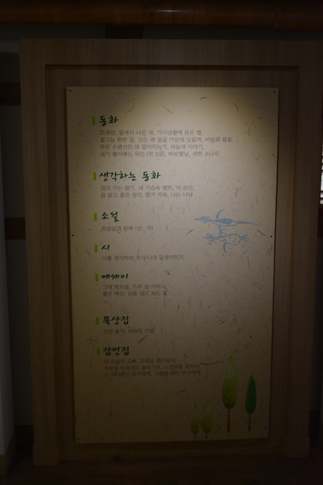 정채봉관 역시 같은 구성이다. 그의 삶과 문학을 연대기로 잘 정리해 두었고, 그의 작품들을 동화, 소설, 에세이, 시 등으로 장르별로 정리해 두었다.