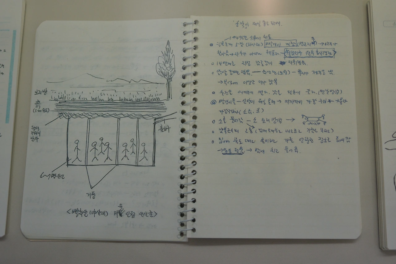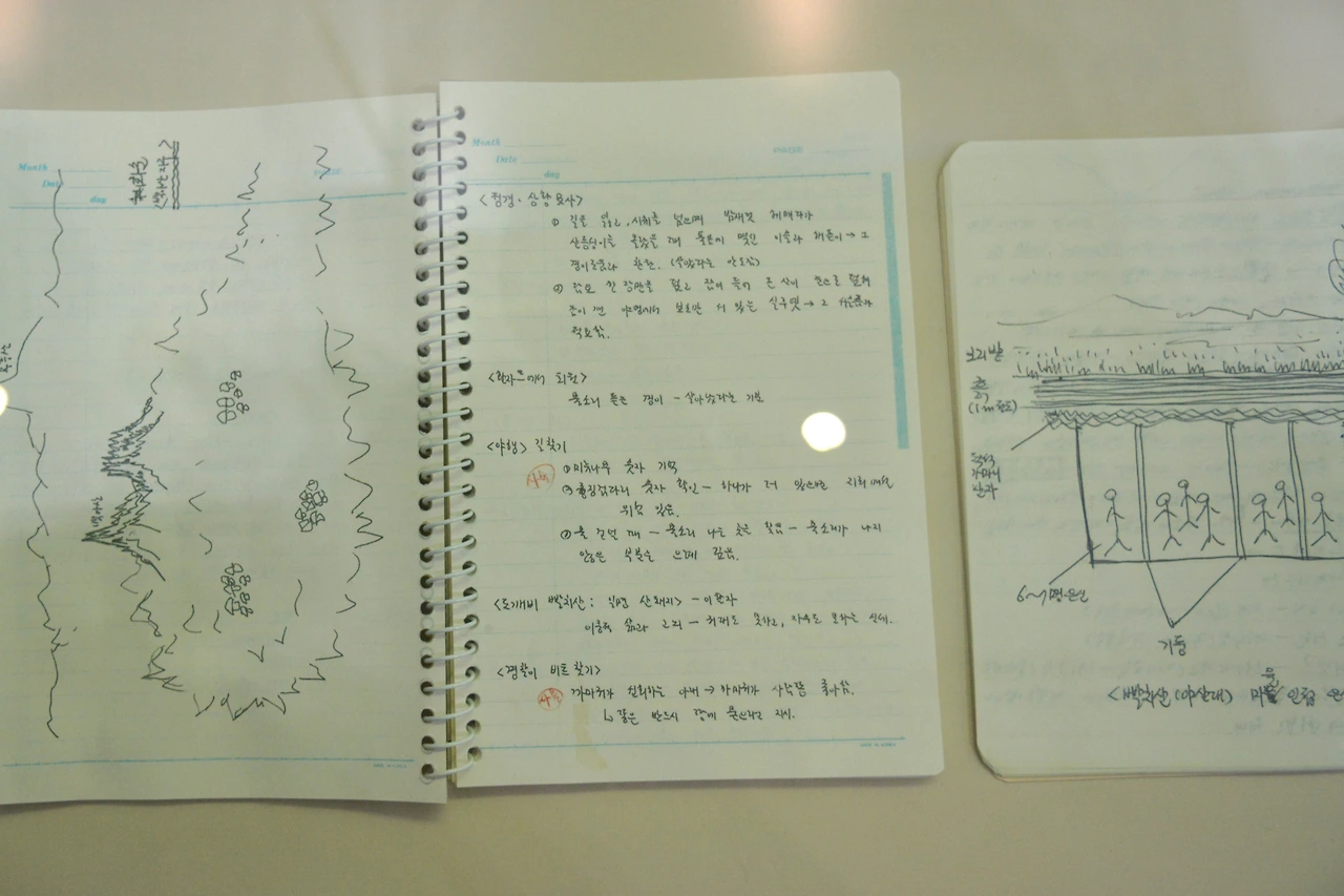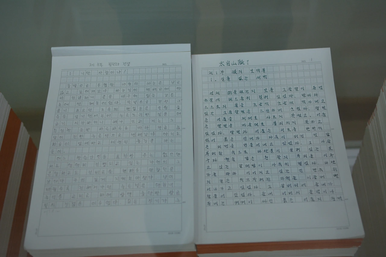 2층은 조정래 작가의 삶과 문학세계, 세미나실이 있었고, 가장 눈길이 가는 곳이 바로 독자들의 필사 전시 공간이었다. 나도 태백산맥을 감명 깊게 읽었고, 가치 있는 작품으로 평가하고는 있지만 여기 필사본 전시실을 보며 첫 느낌은 '뭐지? 이 소설을 독자들이 이렇게 전부 필사를 했다고?'였다. 부정적인 평가가 아니다. 놀라움이었다. 도대체 이 긴 대하소설의 어떤 점에 끌려 이렇게 많은 사람들이 한 자 한 자 손으로 써서, 게다가 자신이 소장하지 않고 문학관에 기증을 했다는 점이 놀라웠다.