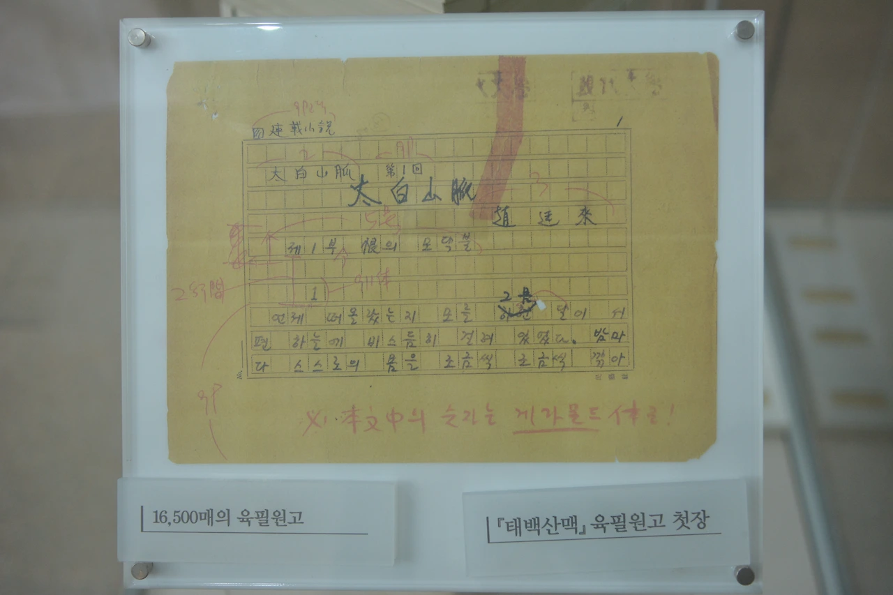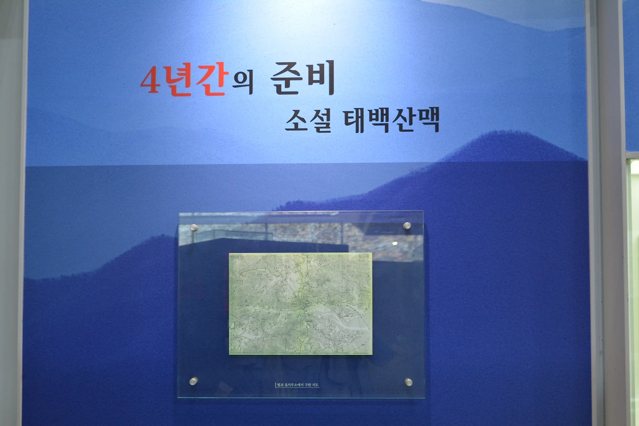 소설을 집필하기 위해 10년간의 노력을 한눈에 볼 수 있도록 구성했다. 소설적 공간의 지도, 빨치산 은신굴에 대한 그림, 그리고 여러 상황 설정 등 조정래의 친필 노트를 통해 들여다볼 수 있었는데, 당시 지리산을 다니며 취재하던 작가의 옷과 지팡이 등산화도 전시되어 있어 작가의 노력을 엿볼 수 있도록 잘 구성해 놓은 것이 인상적이었다.