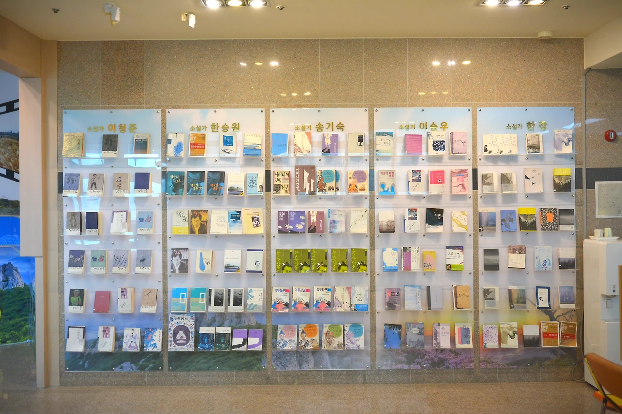 입구 오른쪽으로는 사무실과 '장흥문학 전시홀'이 있어, 장흥출신 작가들의 책이 전시되어 있다. 한강 작가의 책도 전시되어 있었다. 미처 사진을 찍지 못하고 나왔는데, 장흥문학 전시홀 안쪽으로 큰 마루처럼 꾸며 놓은 북카페 형태의 공간이 있다. 신발을 벗고 들어가 위의 오른쪽 사진의 작가별로 전시되어 있는 책들을 자유롭게 읽을 수 있고, 북카페 안 책장에는 더 많은 책들이 꽂혀있다.