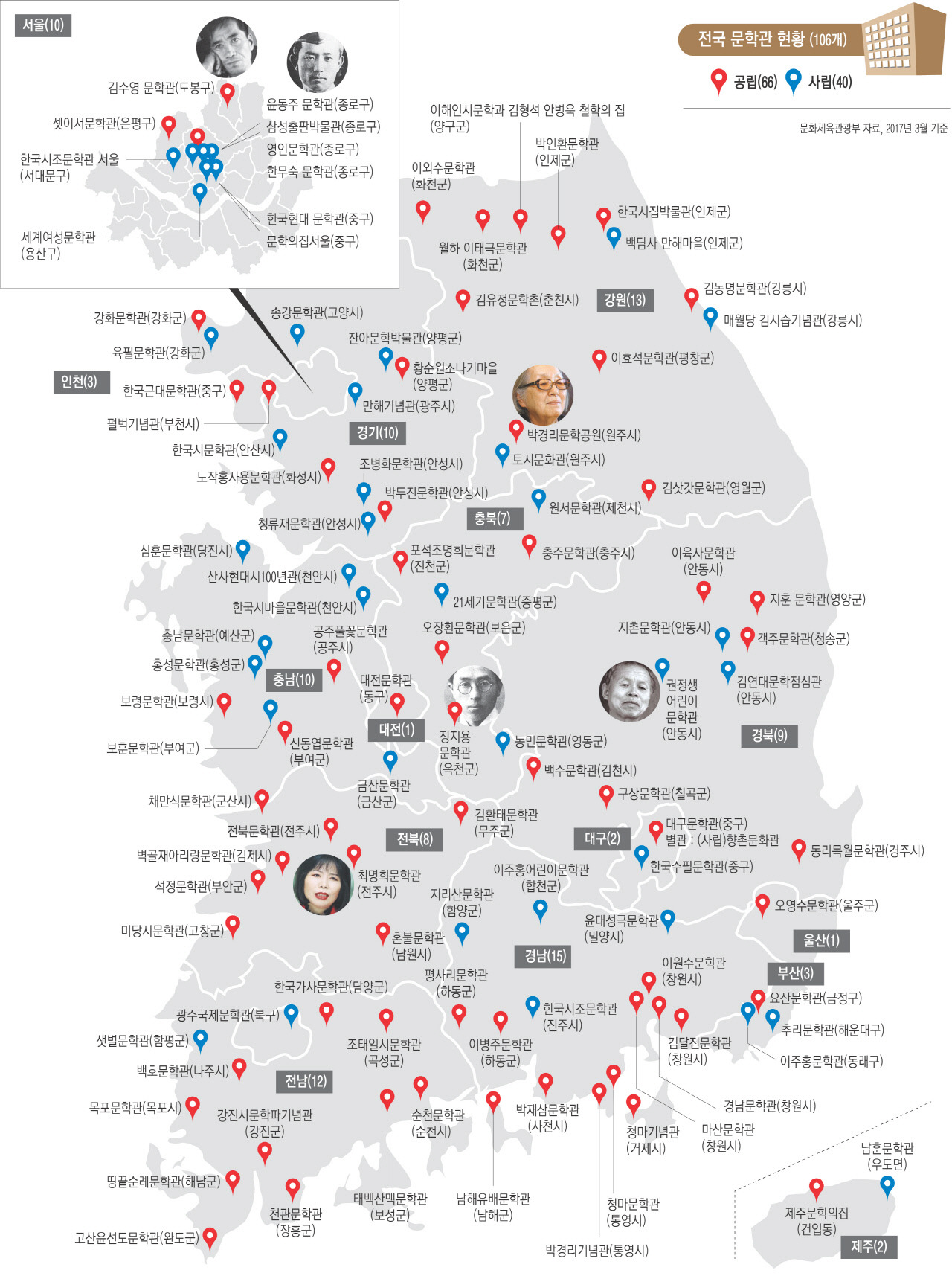 지도에 넣고 보니 너무 좋은 자료임을 알 수 있었다. 지역별로 색깔을 달리해서 한눈에 보기 좋은 자료다. 이 정도의 자료가 만들어진 것만으로도 충분히 의미 있는 일인 것 같다. 그리고 기사를 읽으면서 '국립한국문학관' 설립에 대한 이야기들에 주목하게 되었다. 이 기사를 처음 보았을 때, 단순히 지도 자료를 얻는데 집중하는 바람에 미처 인지하지 못했던 내용이었다. 천천히 기사 내용을 보니 '국립' 한국 문학관을 설립과 관련된 특집 기사들이었다.